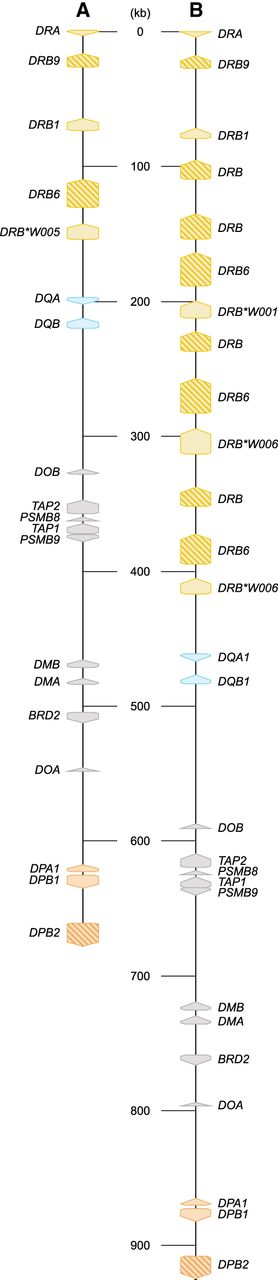 Two illustrative maps of the MHC class II region in rhesus macaques. The shortest (A) and longest (B) assembled MHC class II haplotypes are depicted at scale and allele-level resolution. The genes are indicated by colored arrows, which indicate the transcription orientation, with the DR genes in yellow, the DQ genes in blue, and the DP genes in orange. The other genes encoding products that are involved in peptide processing are depicted with gray arrows. Pseudogenes are indicated with a striped pattern. Allele-level information is provided for all 21 resolved MHC class II haplotypes in Supplemental Table S1.