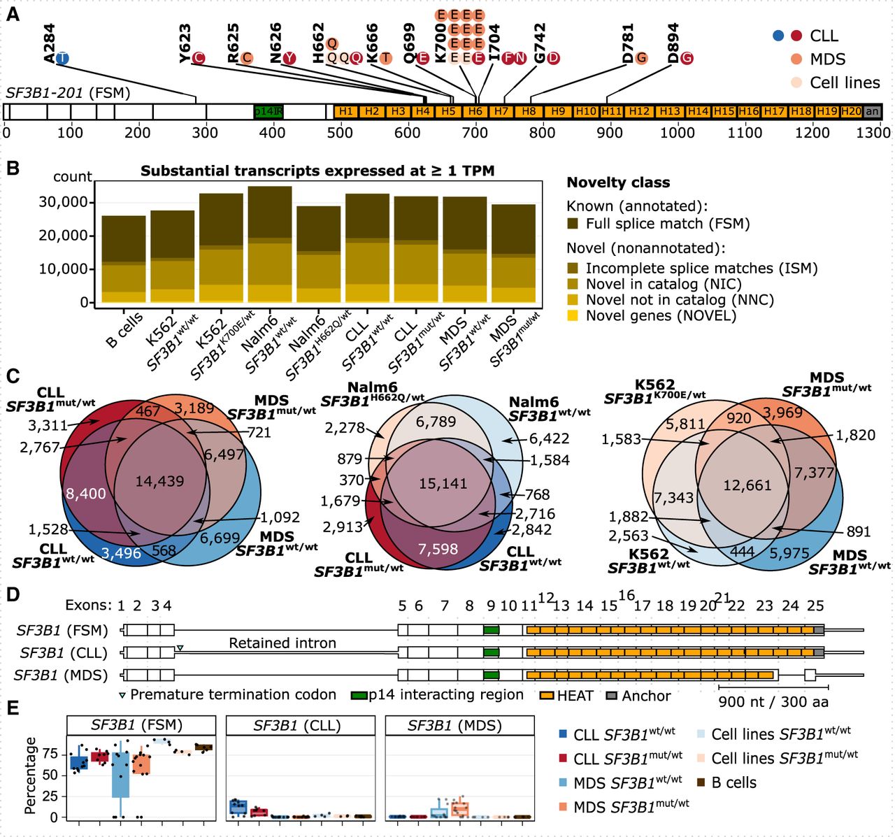 Long-read sequencing of CLL and MDS patient samples discovers novel isoforms. (A) Distribution of SF3B1 mutations in CLL and MDS patient samples used for Iso-Seq; each dot represents a mutated sample. One CLL patient is marked twice owing to two mutations (I704N and D894G). Note that the A284T mutation is outside the HEAT repeat domains and thus was grouped as a wild-type sample, also according to further analysis described below. SF3B1 is shown as the major isoform expressed, with the full splice match (FSM) to annotated isoform 201. (B) The number of substantial transcripts identified in each group and expressed at the level of at least one transcript per million (TPM) colored by the category of isoform novelty: with FSM, with incomplete splice matches (ISMs), with combinations of annotated splice junctions (novel in catalog [NIC]), with at least one novel splice site (novel not in catalog [NNC]), or from novel genes (NOVEL) (Tardaguila et al. 2018). (C) Venn diagrams showing the overlap between isoforms from B expressed at one or more TPM in each group. (D) SF3B1 isoforms expressed at >10% relative expression level. (E) Relative expression levels of SF3B1 isoforms from D.