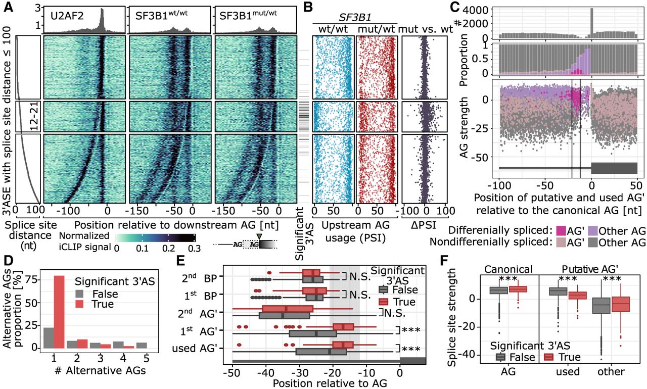 SF3B1 promotes alternative proximal AG′ usage. (A) U2AF2 and SF3B1 binding to pre-mRNA based on the iCLIP signal. U2AF2 iCLIP was performed using K562-SF3B1wt/wt cells, and SF3B1 iCLIP was performed on K562-SF3B1wt/wt and K562-SF3B1K700E/wt. On the left panel, the splice-site distance is shown, followed by the iCLIP signal aligned to the more downstream AG used. The significance of the differential 3′AS usage between K562-SF3B1wt/wt and K562-SF3B1K700E/wt is shown as annotation bar on the right side of the iCLIP signal heatmap. (B) For every 3′AS from A, the upstream AG PSI value is denoted for SF3B1wt/wt (blue, left), SF3B1mut/wt (red, center), and the difference between SF3B1mut/wt and SF3B1wt/wt (black, right). (C) Distribution of AG occurrence (top), proportion of significantly alternatively used AG′ (middle), and AG′ scores among introns with significant (pink) or nonsignificant (violet) difference in usage between SF3B1mut/wt and SF3B1wt/wt (bottom). (D) Number of alternative AGs (AG′s) among regions with multiple AG′s. AG′s within 6 nt distance from AG were removed to avoid NAGNAG acceptor sites (Hiller et al. 2004). (E) Distance of AG′s and BPs from AGs among nonsignificant (gray) and significant (red) differentially splicing events. (F) Splice-site strength of canonical and alternative AGs as calculated with MaxEnt score (Yeo and Burge 2003). (A–F) Only 3′ASs with the following features were used: (1) placed chromosome scaffold, (2) classical AGs, (3) an intron became shorter in the mutant (the use of upstream alternative AG′), and (4) overlap with an iCLIP cross-link. The more used AG in SF3B1wt/wt was set as canonical AG.