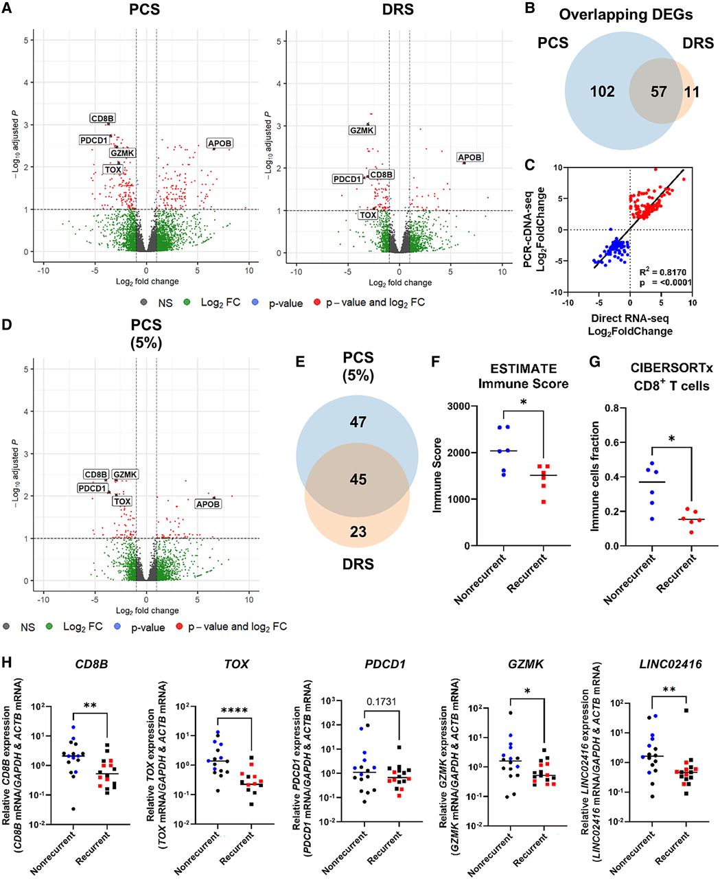 ccRCC recurrence is associated with suppressed tumor immune infiltration. (A) Volcano plots showing DEGs (red) between recurrent and nonrecurrent ccRCC tumors from PCS and DRS data using Ensembl genome reference (Ensembl release 105). (B) Venn diagram showing overlaps of DEGs identified by both PCS and DRS. (C) Correlation between log2FoldChange of DEGs identified by either or both PCS and DRS (recurrent vs. nonrecurrent ccRCC tumors). Diagonal line represents the line of best fit. R2 value was computed to measure goodness-of-fit and P-value was generated from F-test, with P ≤ 0.05 considered statistically significant. (D) Volcano plots showing DEGs (red) between recurrent and nonrecurrent ccRCC tumors from 5% subsampled PCS data using Ensembl genome reference (Ensembl release 105). (E) Venn diagram showing overlaps of DEGs identified by both 5% subsampled PCS and DRS. (F) Grouped dot plot showing an estimated immune score of nonrecurrent (blue) and recurrent (red) ccRCC tumor by the ESTIMATE algorithm, using PCS gene expression data. (G) Grouped dot plot showing the relative population of CD8+ T cells within immune infiltrates of nonrecurrent (blue) and recurrent (red) ccRCC tumors estimated by CIBERSORTx using PCS gene expression data. (H) CD8B, TOX, PD-1, GZMK, and LINC02416 mRNA levels measured by qRT-PCR in recurrent and nonrecurrent tumors from the sequenced cohort (blue and red, n = 12) and validation cohort (black, n = 20), relative to average mRNA levels in nonrecurrent tumors. mRNA levels were normalized to GAPDH and ACTB. For (A) and (D), blue and red dots represent significantly down and upregulated genes by either or both PCS and DRS. Dotted lines indicate the significance threshold (|log2FoldChange| ≥ 2, Padj ≤ 0.1). Names of genes that were validated by qRT-PCR with validation cohort are shown. For (F)–(H), two-tailed Mann–Whitney U tests were used with P ≤ 0.05 considered significant. (*) P < 0.05, (**) P < 0.01, (****) P < 0.0001. Line represents the median for each group.