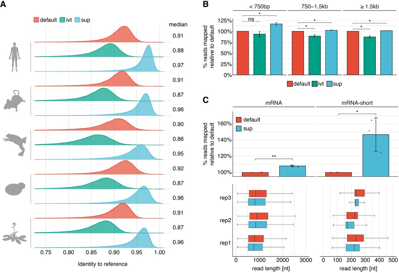 SUP is a super high accuracy model that leads to improved read accuracy and mapping. (A) Cross species comparison of read accuracies obtained from each model. Reads were aligned to the respective reference transcriptome (see Supplemental Table S5). To account for vastly different expression levels that would bias the analysis toward strongly expressed genes, we filtered for the longest reads of each transcript, keeping at most 10 reads per transcript. (B) Comparison of reads mapped to the human reference transcriptome (n = 3) across three bins of read lengths. Error bars indicate ± 1 SD. Statistical significance was determined using a two-sided t-test, corrected for multiple hypothesis testing using the Benjamini–Hochberg procedure: (ns) P ≥ 0.05, (*) P < 0.05). (C) Effect of distinct basecalling models on the proportion of mapped reads obtained from standard poly(A)-selected human samples (median length ≅ 850 bp) and a synthetic RNA library consisting of three polyadenylated in vitro transcripts (median length ≅ 200 nt). Statistical significance was determined using a one-sided t-test, and results were corrected for multiple hypothesis testing using the Benjamini–Hochberg procedure: (ns) P ≥ 0.05, (*) P < 0.05, (**) P < 0.01. Box plots depict the underlying size distribution of the sequenced libraries. The box is limited by the lower-quartile Q1 (bottom) and upper-quartile Q3 (top). Whiskers are defined as 1.5 × IQR with outliers being removed.