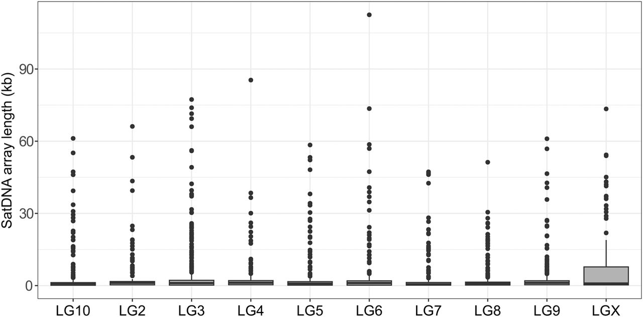 Distribution of Cast1–Cast9 satDNA array lengths across chromosomes, LG2–LG10 including the X Chromosome (LGX).