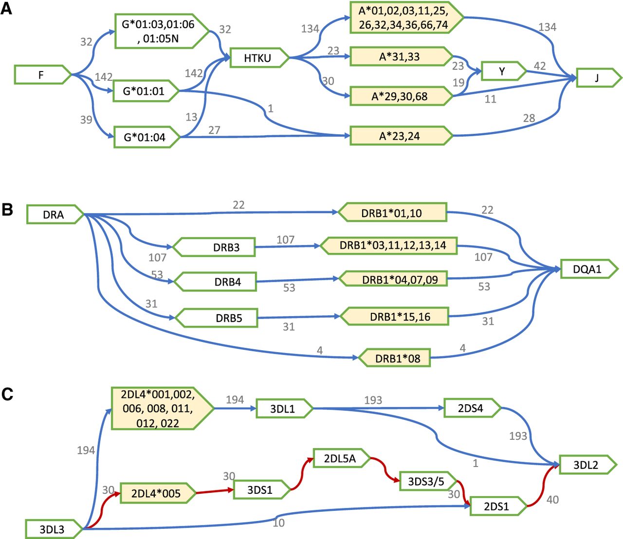 Local haplotype structures and their linkage to HLA/KIR alleles. (A) Haplotypes with the deletion of the HLA-H, -T, -K, and -U genes (HTKU-del) and the deletion of the HLA-Y gene. (B) DR haplotypes. (C) Haplotypes in the KIR telomere region.