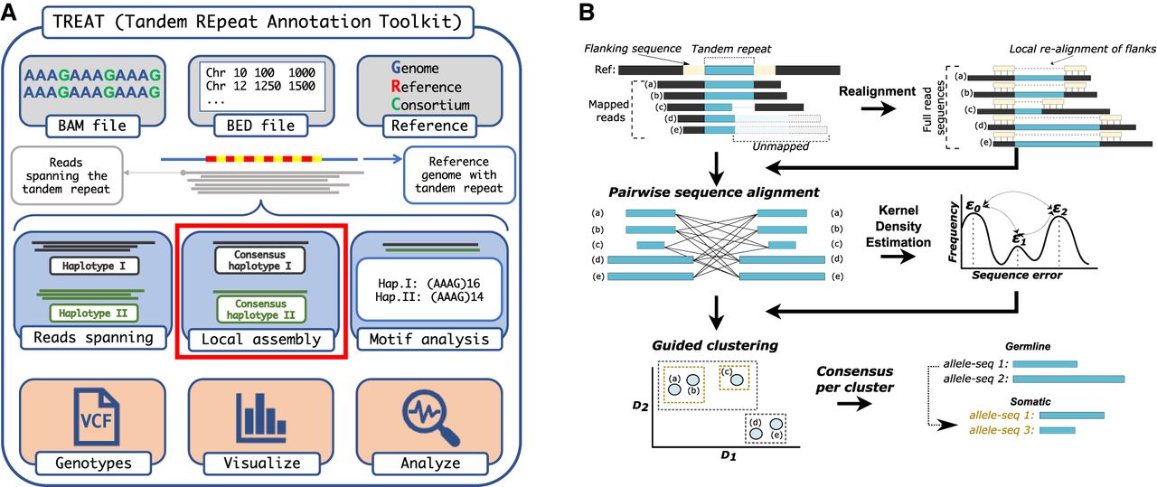 Schematic workflow of TREAT and otter. (A) TREAT workflow, highlighting the required inputs, the main features, and the main outputs of the tool. The red box highlights the main genotyping engine based on otter. (B) The main algorithmic steps of otter, a novel targeted local assembler for long-read sequencing data.