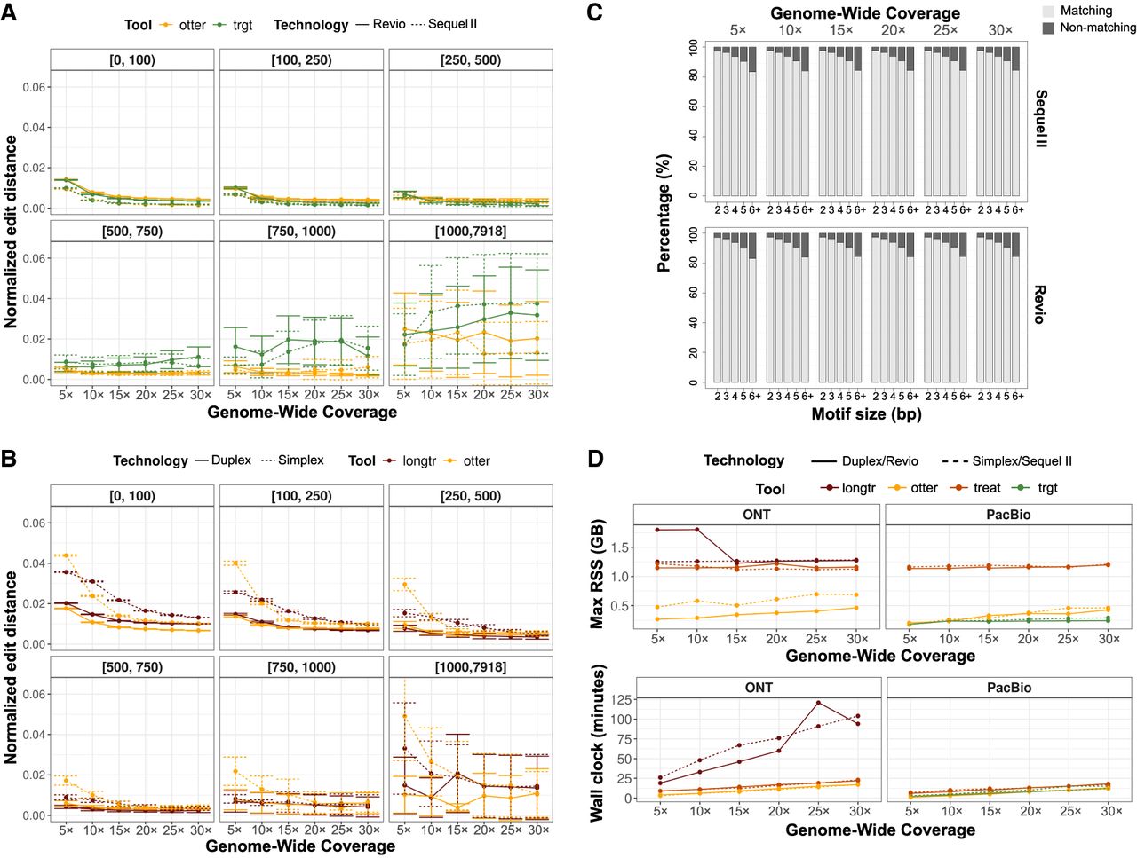 Benchmarking between TREAT/otter, TRGT, and LongTR. (A) Genotyping accuracy of otter and TRGT on PacBio Sequel II and Revio data, stratified by TR size, and sequencing depth. (B) Genotyping accuracy of otter and LongTR on ONT Simplex and Duplex data, stratified by TR size and sequencing depth. (C) Motif identification accuracy of TREAT and TRGT on PacBio Sequel II and Revio data, showing the overlap of matching motifs, stratified by motif size and sequencing depth. (D) Memory usage and running time of otter, TREAT, TRGT, and LongTR, across technologies and sequencing coverages.
