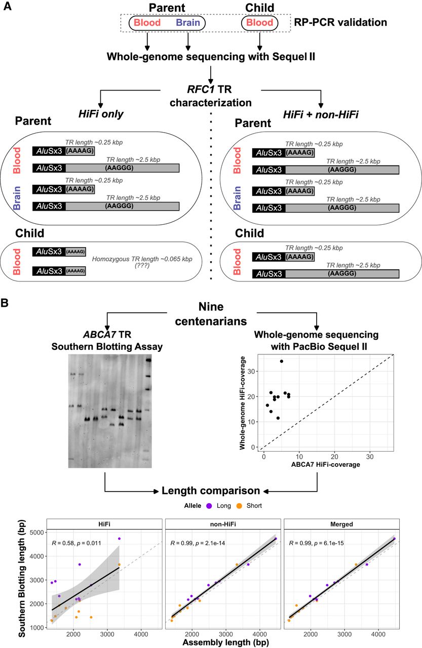 Coverage drops in TR in RFC1 and ABCA7 genes, associated with CANVAS and AD. (A) The genotyped TR alleles and relative motif characterization in a parent–child duo using only HiFi data, and HiFi + non-HiFi data. Long-read data from the brain of the parent were also available. Adding non-HiFi data rescued the missing allele in the child. (B) The comparison between experimentally validated alleles in the TR intronic of ABCA7 gene, and genotyped alleles based on HiFi data alone, and HiFi + non-HiFi. Experimental validation of TR alleles was performed with Southern blot assay, and was available for nine individuals for which long-read data were also available. When adding non-HiFi data, we could recover the expanded alleles in the child that were missed by HiFi data alone.