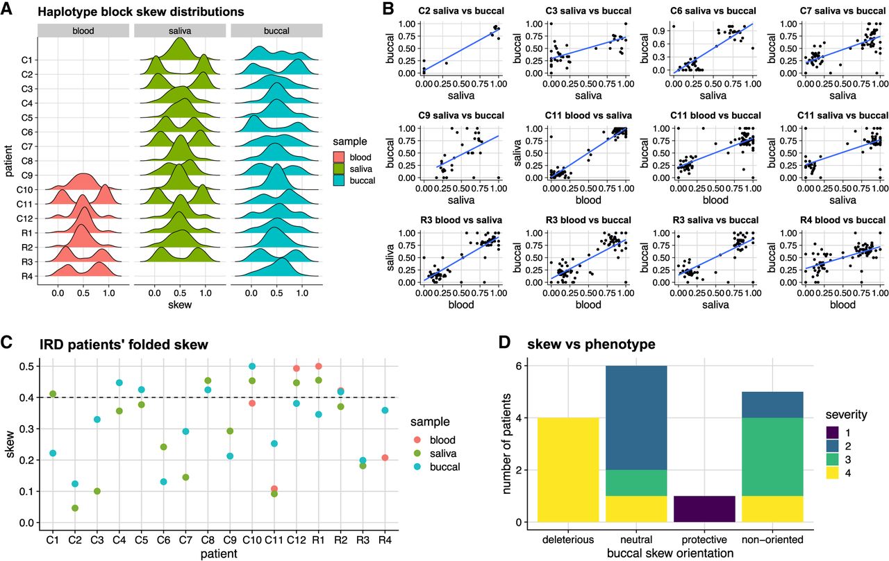 X inactivation skew in a cohort of patients with X-linked inherited retinal disorders. (A) Distribution of haplotype blocks’ skews in multiple samples from patients carrying mutations in the CHM gene (C1–C12) or RPGR gene (R1–R4). (B) Correlations of haplotype blocks’ skew between samples indicates consistency in preferential Xa choice across tissues, for each patient for whom two or more samples show skew (P < 0.4). (C) Summary of tissue skews for each patient. (D) Correlation of buccal skew with phenotypic severity. The skew is classified as either deleterious (variant allele is preferentially Xa), protective (variant allele is preferentially Xi), or neutral (no or little skew, P ≥ 0.4). For six CHM variant carriers with skewed buccal swab samples, the skew could not be oriented (nonoriented category). Retinal severity grading presented in this graph is depicted as grades 1–4 to combine retinal phenotypes for choroideremia and RPGR-associated X-linked retinitis pigmentosa (Edwards et al. 2015; Nanda et al. 2018): grade 1 is fine and normal phenotypes, grade 2 is coarse and radial pattern phenotypes, grade 3 is geographic and focal pigmentary retinopathy phenotypes, and grade 4 is male-pattern phenotypes for choroideremia and RPGR-associated X-linked retinitis pigmentosa, respectively.