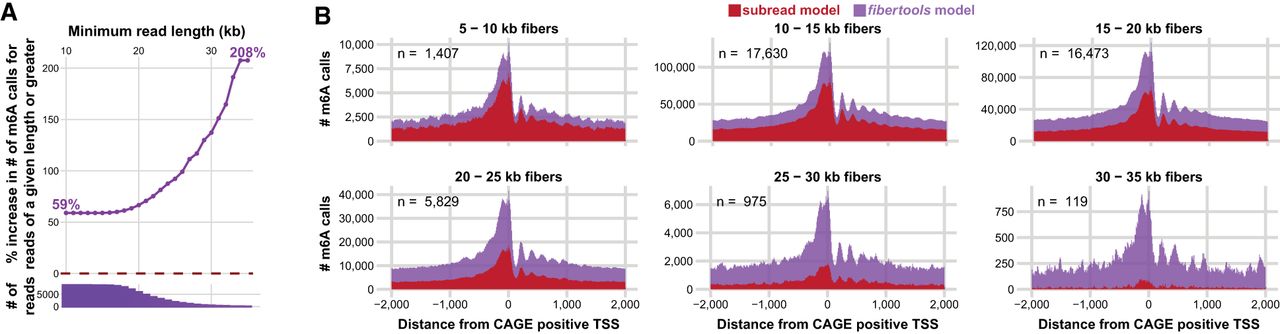 Increased m6A calling on long reads (>20 kb) via fibertools. (A) Percentage increase in fibertools m6A calls over the GMM model as a function of the minimum read length of the underlying sequencing data. The histogram below shows how many reads were used to calculate each percentage increase. (B) Comparison of fibertools and the subread model for m6A calling over CAGE-positive TSS in K562 cells across the genome, separated by read length. Reads are matched between fibertools and the subread model, and the number of Fiber-seq reads used in the calculation of each size range (n) is indicated.