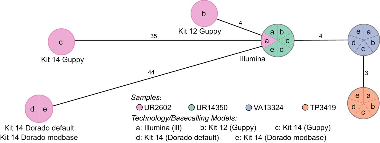 cgMLST typing reveals allelic differences between genomes utilizing different basecaller models and sequencing kits. The minimum spanning tree pictures four K. pneumoniae samples based on 2358 genes for pairwise comparison of allelic variations. Missing values were ignored. Nodes (samples) are connected by lines depicting the distance by numbers of allelic differences. Loci are considered different if one or more bases change between the samples. Loci without allelic differences are described as being the same. Samples with allelic differences of 15 or fewer are considered as part of the cluster. All isolates were prepared with Kit 14 and Kit 12 and basecalled with each respective Guppy “superaccurate” basecalling model (see subsection “Basecalling and assembly” in the Methods). We basecalled all Kit 14–prepared samples with Dorado using the default and a modification-aware model (see subsection “Basecalling and assembly” in the Methods).