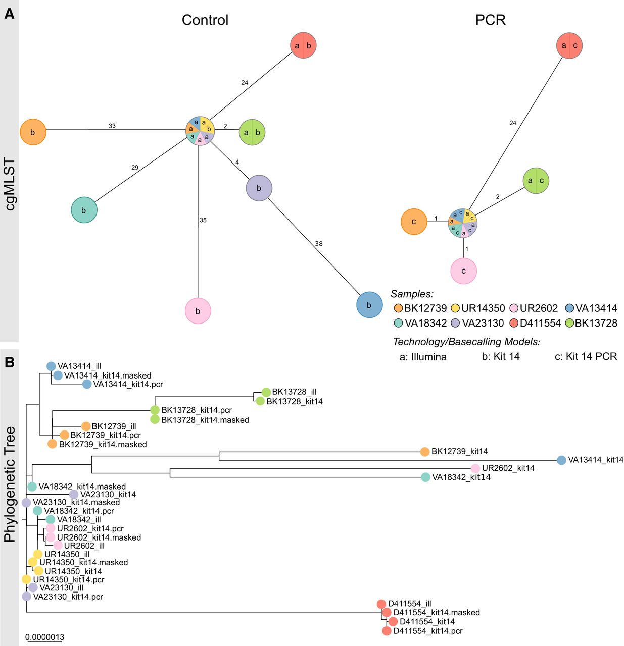 PCR-based sequencing or masking of ambiguous positions reduces allelic or phylogenetic distances. (A) Minimum spanning trees (pairwise ignore missing values) of each of eight K. pneumoniae outbreak samples based on 2358 genes to compare allelic differences between Illumina and Nanopore SQK-NBD114.24 genomes (Kit 14; left) and Illumina and Nanopore SQK-RPB114.24 genomes (PCR; right). Nodes (samples) are connected by lines depicting the distance by numbers of allelic differences. Loci are considered different whether one or more bases change between the samples. Loci without allelic differences are described as being the same. Samples with allelic differences of 15 or fewer are considered as part of the cluster. (B) Phylogenetic tree based on core genome SNP alignment between eight K. pneumoniae outbreak samples (colored nodes), prepared with Illumina (ill), Nanopore SQK-NBD114.24 (Kit 14), and SQK-RPB114.24 (Kit 14 PCR) compared with the masked Kit 14 assemblies (masked).