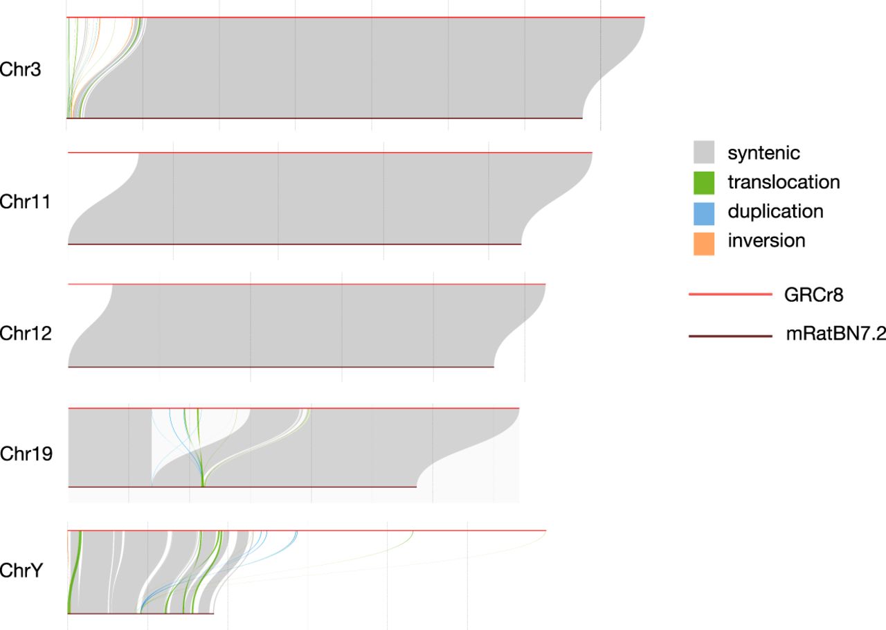 Synteny analysis was performed with SyRI software to illustrate the shared regions of chromosomes with the largest percentage increase in size in the present assembly compared with mRatBN7.2. Chr 3, Chr 11, and Chr 12 are acrosomal chromosomes in which rDNA arrays are located in the acrosomal arms. The current assembly has greatly extended the chromosome in the region of these arms. Chr 19 shows a large insertion spanning >15 Mb that was not included in mRatBN7.2. Chr Y shows good synteny with mRatBN7.2 across the Y-specific coding regions of the chromosome. However, the more distal regions were not assembled in mRatBN7.2, undoubtedly reflecting the repetitive heterochromatic region of this chromosome.