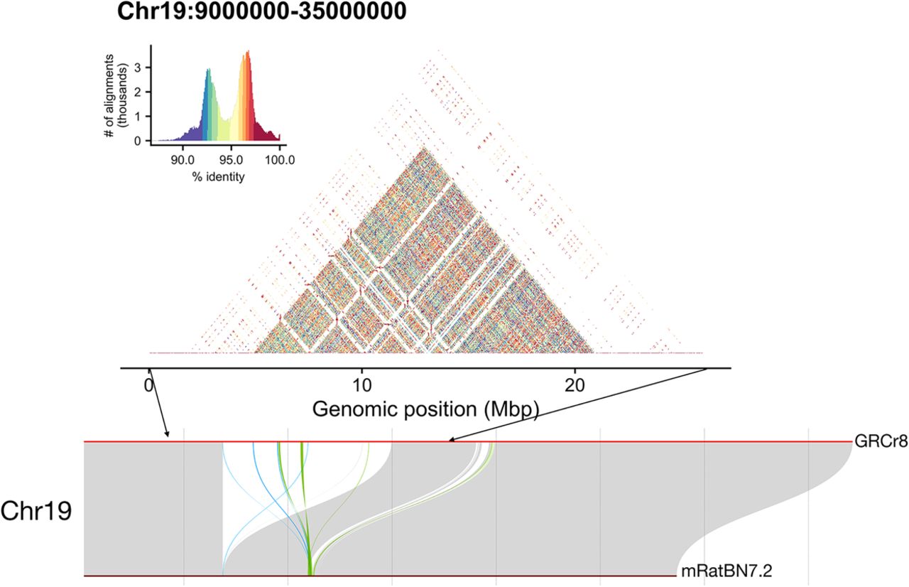 Alignment of Iso-Seq data from several BN tissues obtained from the MCW suggested that the newly incorporated region on Chr 19 shows aligned transcript data across its extent. This is in contrast to newly incorporated centromeric regions in which no aligned transcripts were observed. To investigate further, we examined whether the included region might be composed of expanded genomic sequences with high similarity, such as might occur as the result of repeated segmental duplication. Self-to-self similarity visualization with StainedGlass reveals a highly duplicated structure that lacked the simple expansion observed in centromeric regions. This newly incorporated region of Chr 19 contains 276 previously unmapped RefSeq genes and 12 additional proposed genes from Gnomon annotation analysis.