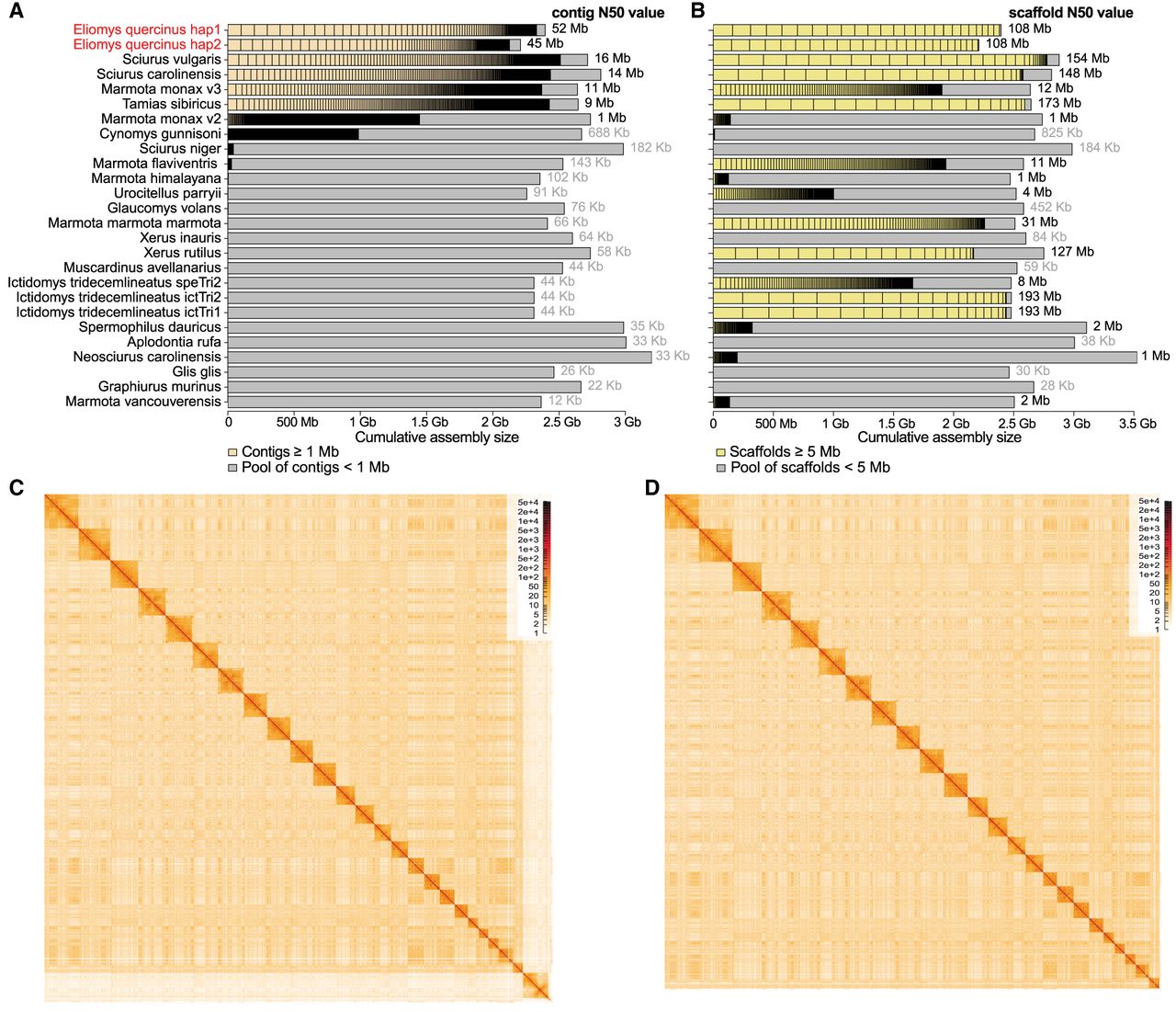 Contiguity and Hi-C maps of both haplotype assemblies. (A,B) Visualization of contig (A) and scaffold (B) sizes of the garden dormouse haplotypes 1 and 2 (red font) and other Sciuromorpha genome assemblies. The N50 values are given on the right side. Contigs shorter than 1 Mb and scaffolds shorter than 5 Mb are not visualized individually, but shown as the gray portion of each bar. (C,D) Hi-C density maps for haplotype 1 (C) and haplotype 2 (D).