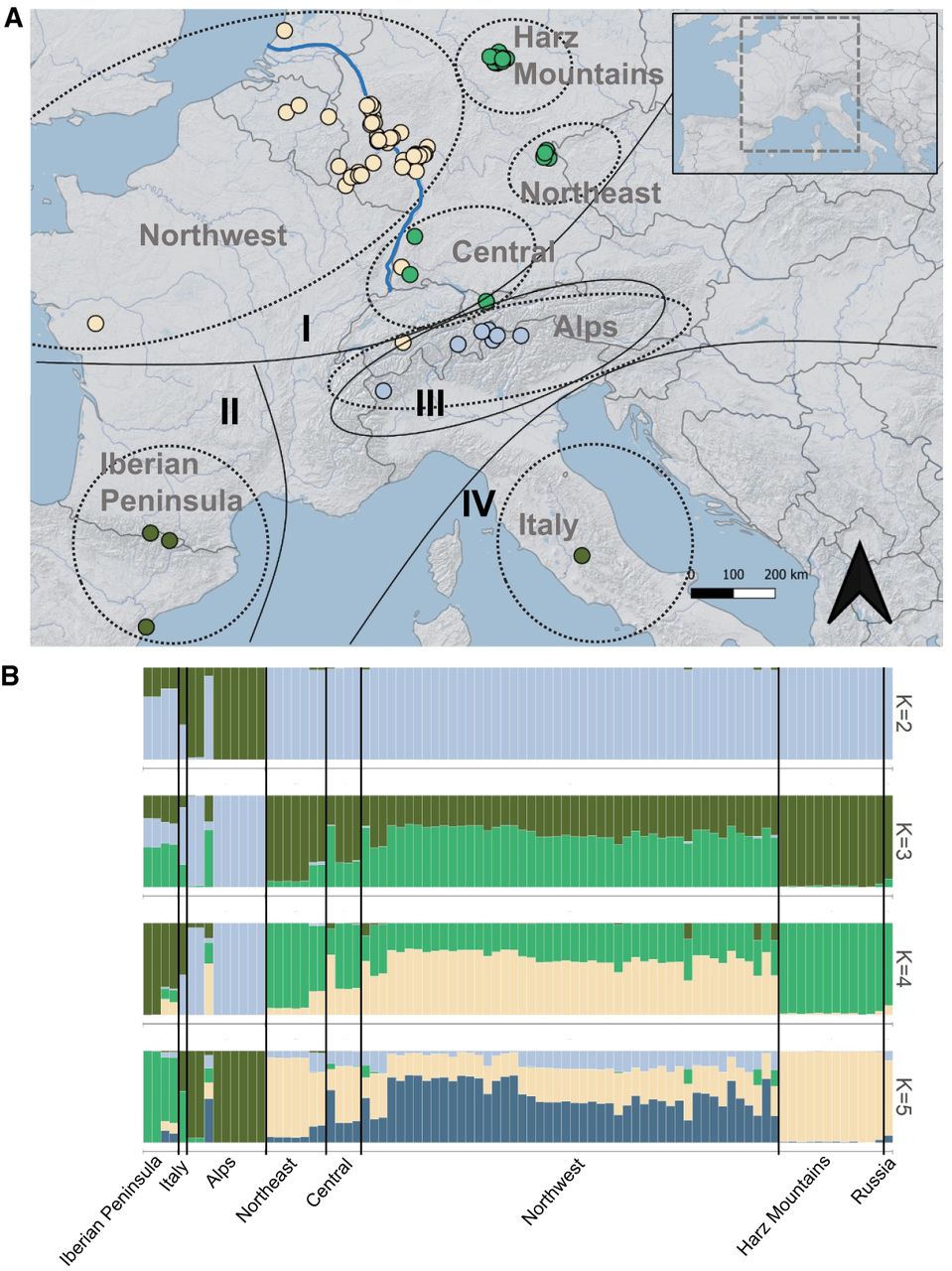 Garden dormouse population structure inferred from 47,115 nuclear SNP loci. (A) Group assignment via five PCs obtained by a discriminant analysis of principal components. The predicted assignment of genetic clusters (K) 1–3 is shown by four different colors and the a priori sampling region identity is highlighted by dotted gray lines and text. The clades I–IV that were previously identified based on mitochondrial DNA (Perez et al. 2013) are outlined in black. One sample from Russia is not pictured. The Rhine River is outlined in blue, and the boundary of the study area is outlined in gray in the inset map. (B) Genetic clustering inferred by Bayesian structure analysis for K ranging from 2 to 5 in STRUCTURE, with x-axes representing geographic sampling location and y-axes the proportion of group membership.