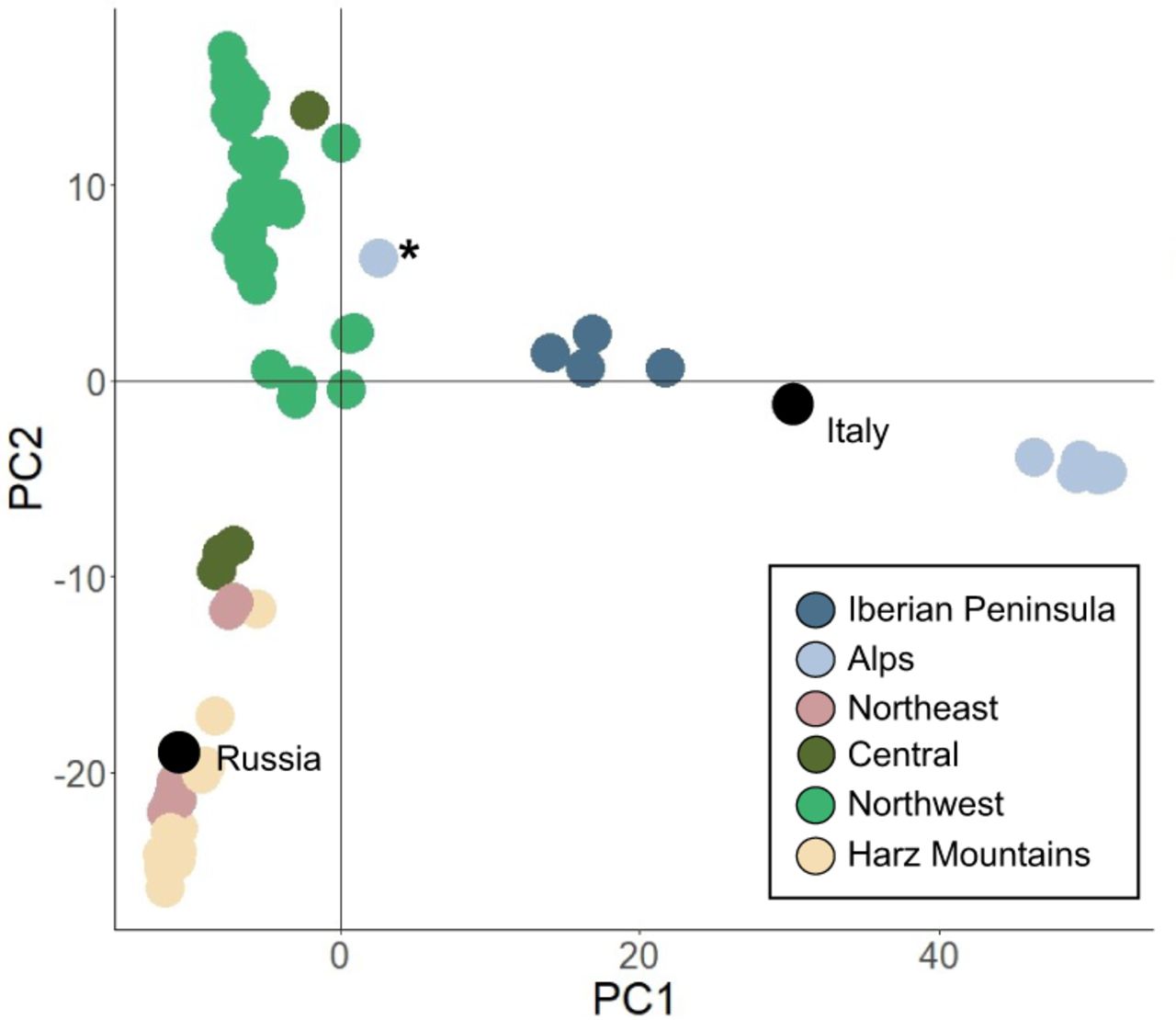 PCA for the garden dormouse. The PCA is based on 19,022 nuclear SNP loci, with colors representing the geographical origin. Results are plotted on the first two principal components, with PC1 explaining 14.48% and PC2 8.19% of variation within the data set. Regions where n = 1 (Italy and Russia) are indicated by black circles, with region names labeled within the plot. One individual from the Alps clustered separately from the Alpine region and is marked with an asterisk.