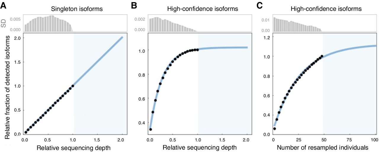 Saturation analysis on the sequencing depth and number of sampled individuals. (A,B) The relative fractions of detected isoforms supported with singleton FLNC read versus two or more FLNC reads (high-confidence isoforms) with increasing random resampling of the Iso-Seq sequencing depth, respectively. The resampling sequencing depths were selected from 0.05 to 1, with a step size of 0.05. The blue area shows the prediction after doubling the actual Iso-Seq sequencing depth. The illustration is based on one randomly selected individual (GE3) in the GE population; the analogous results for individuals from other populations are provided in Supplemental Figures S8 and S9. (C) Relative fractions of detected isoforms with increasing random resampling sample sizes of individuals in the main experiment. The resampling sequencing sizes were selected from 2 to 48, with a step size of 2. The blue area shows the prediction after doubling the current sampling of mice individuals. The bar plots show the SD of each resampling analysis.