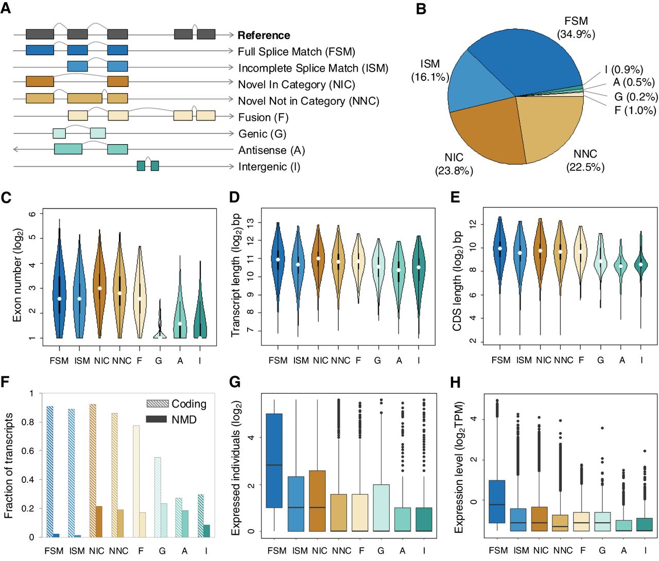 Characterization of all detected high-confidence isoforms. (A) Types and illustrations of identified isoforms. Novel transcript versions are depicted in italics. (B) Fraction distribution of isoform structural categories (see isoform annotations in Supplemental Data S2). (C–H) The distributions of isoform types for distinct features. Isoforms with expression were defined as those with nonzero TPM values, and the expression levels were computed based on the number of supported FLNC reads using SQANTI3 (Tardaguila et al. 2018). Boxes represent the IQR (distance between the first and third quartiles), with white dots (or black lines) in the middle to denote the median. The boundaries of the whiskers (also the ranges of violins for panels C–E) are based on the 1.5 IQR values for both sides; black dots in G and H represent outliers.