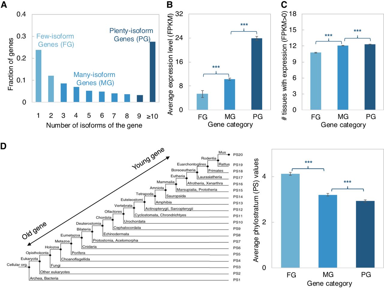 Characteristics of gene loci with different numbers of isoforms. (A) Gene categories are based on the number of isoforms of each gene. Three gene categories were classified with roughly the same number of genes in each group. (B) Comparison of the average gene expression level among the three gene categories. The average gene expression level was calculated based on the Illumina RNA-seq generated in this study. (C) Comparison of the number of tissues with expression among the three gene categories. The transcriptomic sequencing data from 13 tissues of the M. musculus C57BL/6 inbred line was retrieved from Lin et al. (2014). The detectable gene expression in each tissue was defined as FPKM > 0. (D, Left) Depiction of the phylostratum (PS) assignments for mouse protein-coding genes were retrieved from Neme and Tautz (2013). (Right) Comparison of the average PS values among the three gene categories. The smaller PS values indicate the older gene groups. Error bars show SEM values of average gene expression levels, number of tissues with expression, and average PS values, respectively. Statistical P-values in all panels were computed using two-sided Wilcoxon rank sum tests; (***) P-value < 0.001, (**) P-value < 0.01, (*) P-value < 0.05, and (ns) P-value ≥ 0.05.