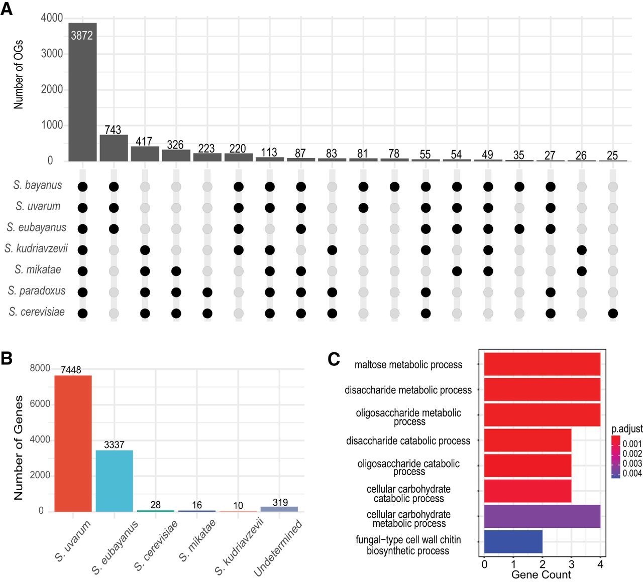 Inference of introgressed genes in the S. bayanus CBS380 genome. (A) Classification and distributions of OGs based on their member species. Only those types with at least 25 OGs are shown in this figure. A black-filled dot represents the presence of member genes in an OG from a specific species, and a gray dot indicates the absence of member genes. (B) The number of genes in S. bayanus CBS380 from each parental genome. (Undetermined) Genes have a P-distance > 0.025 with any orthologous genes, and their origin cannot be confidently determined. (C) Results of GO enrichment of introgressed genes from S. cerevisiae.