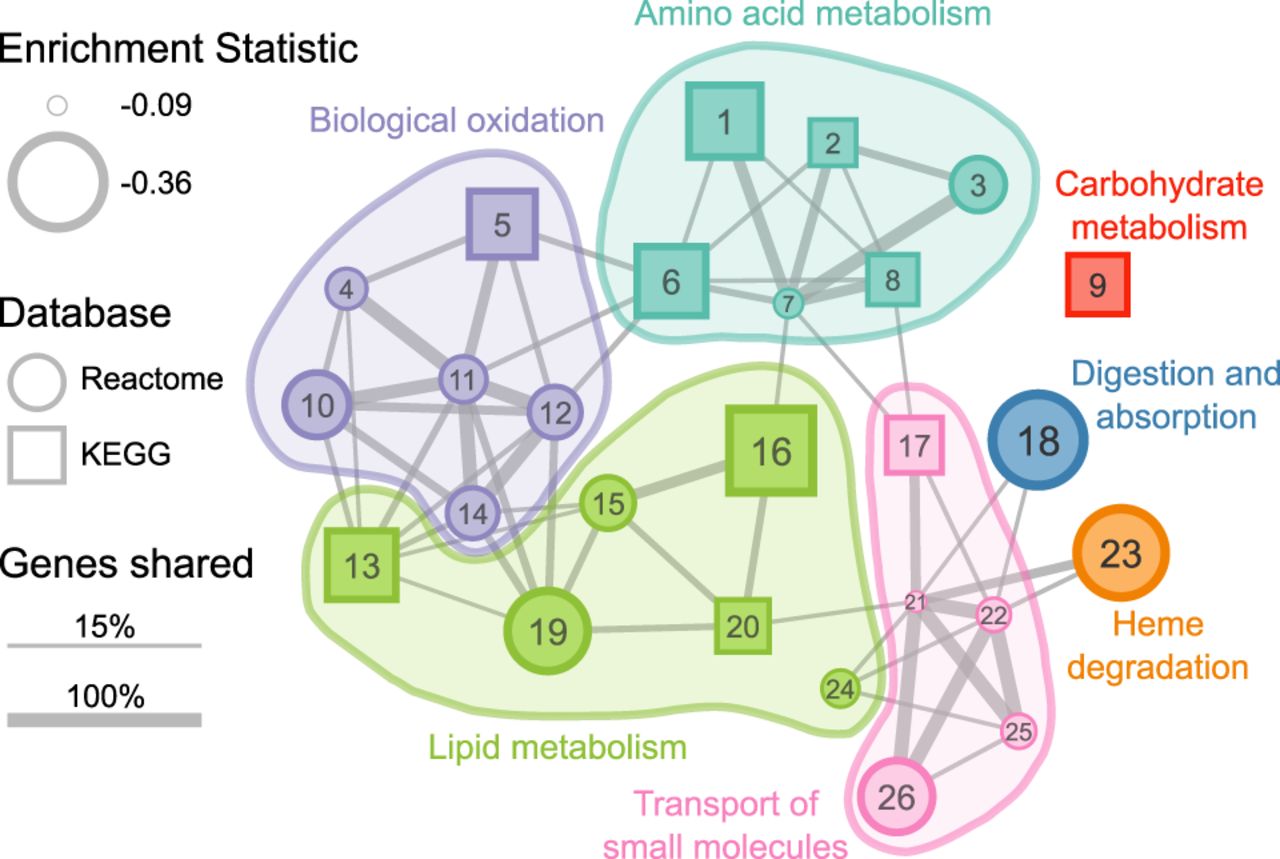 Significantly enriched gene pathways (n = 26) for genes whose evolutionary rates are negatively correlated with carnivory score. Each circle or square represents a gene pathway. Circles and squares represent pathways from the Reactome and KEGG databases, respectively. The size of the shape represents the magnitude of the difference between the distribution of test statistics for genes in that pathway and the distribution for all other genes. Larger shapes, representing pathways with more negative correlation statistics, indicate greater reductions in evolutionary constraint as the carnivory score decreases. The width of lines connecting pathways represents the proportion of shared genes in the smaller gene set. Colors represent the broad functional categories that the pathways occupy. (1) Glycine, serine, and threonine metabolism; (2) Cysteine and methionine metabolism; (3) Sulfur amino acid metabolism; (4) Phase II—Conjugation of compounds; (5) Drug metabolism—Cytochrome P450; (6) Phenylalanine metabolism; (7) Metabolism of amino acids and derivatives; (8) Arginine and proline metabolism; (9) Starch and sucrose metabolism; (10) Metabolic disorders of biological oxidation enzymes; (11) Biological oxidations; (12) Phase I—Functionalization of compounds; (13) Steroid hormone biosynthesis; (14) Cytochrome P450—Arranged by substrate type; (15) Fatty acid metabolism (Reactome); (16) Fatty acid metabolism (KEGG); (17) Proximal tubule bicarbonate reclamation; (18) Digestion and absorption; (19) Synthesis of bile acids and bile salts via 7alpha-hydroxycholesterol; (20) PPAR signaling pathway; (21) Transport of small molecules; (22) SLC-mediated transmembrane transport; (23) Heme degradation; (24) Synthesis of phosphatidylcholine; (25) Transport of bile salts and organic acids, metal ions, and amine compounds; (26) Amino acid transport across the plasma membrane. A table of results for all gene pathways tested (n = 1290) is available in Supplemental Table S5.