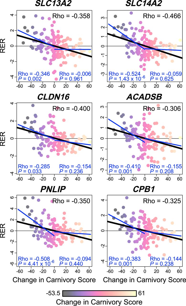 RERs associated with changes in carnivory score across Mammalia for six diet-associated genes: SLC13A2, SLC14A2, CLDN16, ACADSB, PNLIP, and CPB1. As in Figure 1, light yellow and darker purple points indicate increases and decreases in carnivory score, respectively. Lines of best fit represent the relationship between RER and change in carnivory score as inferred by linear regression. Pearson correlation coefficients (Rho) represent the strength and direction of correlations between RER and change in carnivory score. Black lines of best fit and correlation coefficients (upper right values) represent the relationship across all changes in carnivory score, as inferred by our continuous RERconverge analysis. Blue lines, with associated correlations, represent the relationship with RER for only decreases (left) or increases (right) in carnivory score.