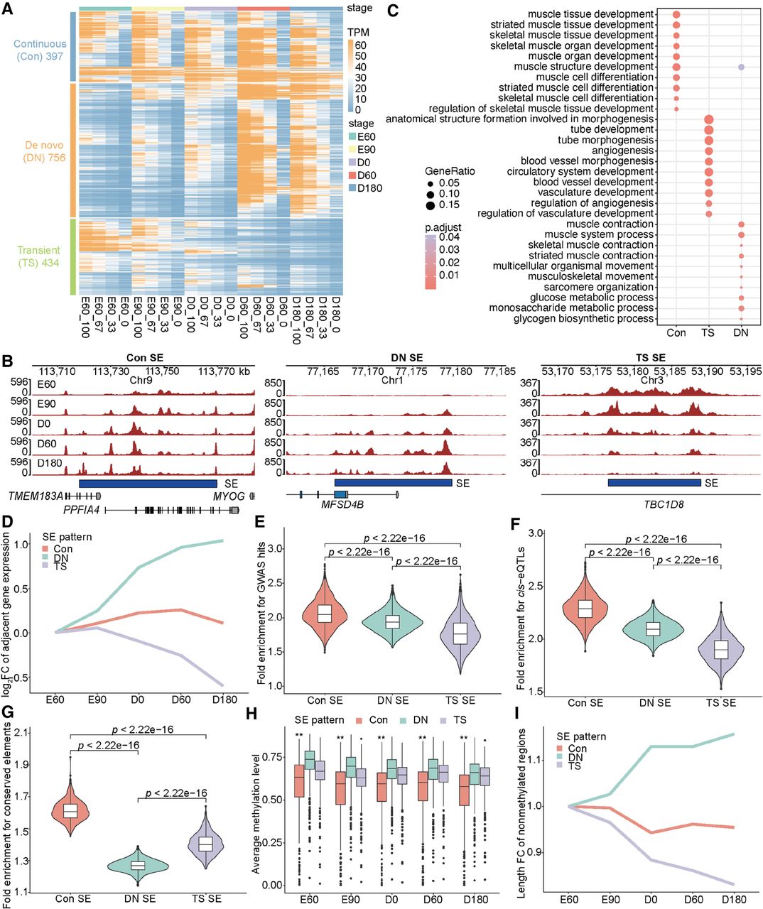 Classification and characteristics of temporal SEs. (A) Hierarchical clustering of SE signal vectors across five developmental stages, showing three distinct clusters. Each row represents an SE, characterized by its four representative enhancer units: strongest (maximum value), upper (second tertile), lower (first tertile), and weakest (minimum value), generated by a linear interpolation approach (see Methods for details). (B) Genome browser snapshots illustrating representative examples of Con, DN, and TS SEs. Tracks display H3K27ac CUT&Tag signals. (C) GO enrichment analysis for Con, DN, and TS SEs. (D) Average expression trends (relative to E60 stage) of genes associated with Con, DN, and TS SEs. Gene expression fold change (FC) values are log2 transformed. (E–G) Fold enrichment of Con, DN, and TS SEs for GWAS hits associated with pig meat and carcass traits (E), PSM cis-eQTLs (F), and mammalian conserved DNA elements (G). (H) Average DNA methylation levels of Con, DN, and TS SEs across five PSM stages. (I) Changes in the length of DNA nonmethylated regions within three types of SEs relative to the E60 stage. CpG sites are classified as methylated or nonmethylated, with contiguous nonmethylated sites merged into nonmethylated regions. See Supplemental Methods for details.