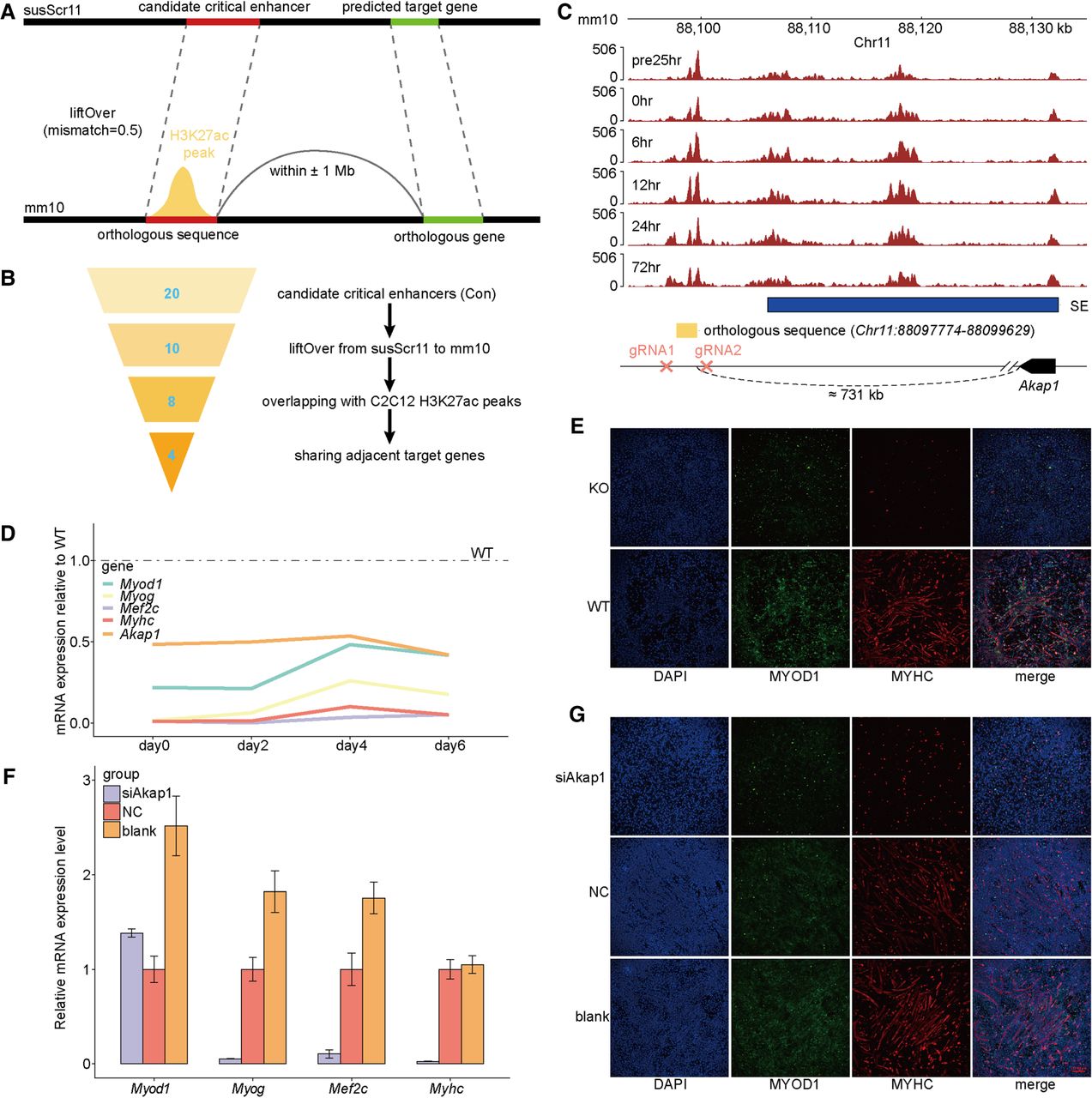 Conservation analysis and functional assay of candidate critical enhancers within Con SEs. (A) Schematic diagram illustrating the mapping of candidate critical enhancers to functional orthologous sequences in the mouse genome. (B) Flowchart illustrating the conservative filtering steps identifying functional orthologous sequences of candidate critical enhancers within Con SEs. The Arabic numerals indicate the number of candidate critical enhancers retained in each filtering step. (C) Genome browser snapshot displaying the mouse orthologous sequence of the candidate critical enhancer Chr12:34230720–34231974, extended 500 bp upstream and downstream. The tracks represent H3K27ac ChIP-seq signals across six stages during C2C12 myogenesis. The 24 h before induction of differentiation are denoted by “pre24hr,” and so forth. The gRNAs targeting the sequence and the predicted target gene were annotated. (D) qPCR analysis of the relative expression of four myogenic markers (Myod1, Myog, Mef2c, and Myhc) and one predicted target gene (Akap1) in wild-type (WT) and knockout (KO) C2C12 cells at four myogenic differentiation time points. KO cells were generated by deleting the orthologous sequence using CRISPR–Cas9. All qPCR data are presented as means ± SD of triplicate experiments. (E) Immunofluorescence staining of WT and KO C2C12 cells after 6 days of differentiation induction. Differentiated myotubes were labeled by immunostaining for MYOD1 (green) and MYHC (red), with nuclei stained by DAPI (blue). (F) qPCR analysis of the relative expression of myogenic markers in C2C12 cells with Akap1 knockdown on day 7 of myogenic differentiation. (G) Immunofluorescence staining for MYOD1 and MYHC was used to assess the effect of Akap1 knockdown on C2C12 differentiation.