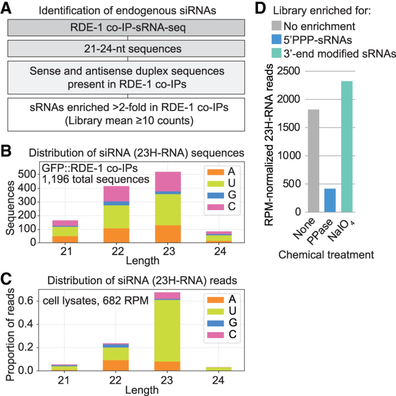 Identification of endogenous canonical siRNAs. (A) Canonical siRNA discovery flowchart. (B) Size and 5′ nt distribution of all endogenous canonical siRNA (23H-RNA) sequences from GFP::RDE-1 co-IP sRNA-seq libraries. n = 2 biological replicates. Data from one representative gravid adult library are shown. (C) Size and 5′ nt distribution of 23H-RNA reads in the cell lysates used for the GFP::RDE-1 co-IP in B. (D) 23H-RNA reads from untreated (none), RNA 5′ polyphosphatase-treated (PPase, reduces 5′ triphosphates), and NaIO4-treated (blocks ligation of non-3′-modified small RNAs) sRNA-seq libraries. n = 1 biological replicate. Libraries from wild-type gravid adults grown at 25°C.