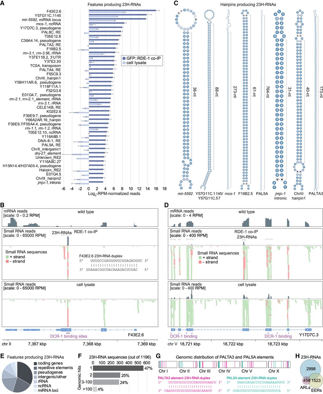 Genomic origins of 23H-RNAs. (A) Mean log2-RPM-normalized 23H-RNA reads from GFP::RDE-1 co-IP and cell lysate sRNA-seq libraries. Only features producing 23H-RNAs with >10 RPM in GFP::RDE-1 co-IPs are shown. Error bars are SD between two biological replicates. Libraries are the same as in Figure 2A. (B) mRNA-seq read density from wild-type animals and sRNA-seq read density from GFP::RDE-1 co-IP and cell lysate libraries plotted along the F43E2.6 23H-RNA locus. Brackets span 23H-RNA clusters. The lower track shows individual sequences but is truncated due to space constraints. The sequence of the most abundant duplex is shown. Purple bars span DCR-1-binding sites based on DCR-1 PAR-CLIP data from Rybak-Wolf et al. (2014). (C) Secondary structures for several 23H-RNA loci that form hairpins. (D) As in B but for the gene Y17D7C.3. (E) The proportion of 23H-RNA loci with >10 RPM in GFP::RDE-1 co-IPs overlapping the indicated features. (F) 23H-RNA sequences are categorized by the number of perfectly matching genomic loci. (G) PALTA3 and PAL5A genomic distribution and the most abundant duplex from each repetitive element. (H) Overlap between 23H-RNA loci and EERs and ARLs. Numbers shown are for total features; 449 23H-RNAs and EERs overlap; 129 23H-RNAs and ARLs overlap; 93 EERs and ARLs overlap; and 24 in common to all three data sets.