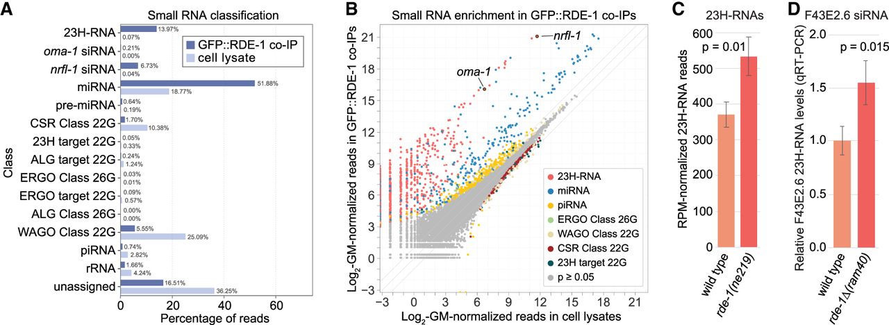 23H-RNAs have a high affinity for RDE-1. (A) Percentages of RPM-normalized reads in GFP::RDE-1 co-IP and cell lysate sRNA-seq libraries corresponding to each class of small RNAs. n = 2 biological replicates. Libraries are the same as in Figure 2A. (B) Scatter plots display individual small RNA features as the average log2-geometric mean-normalized reads in cell lysates (x-axis) and GFP::RDE-1 co-IPs (y-axis) colored by small RNA class. Exogenous siRNAs matching nrfl-1 and oma-1 are circled. (C) RPM-normalized 23H-RNA reads in wild-type and rde-1(ne219) mutant sRNA-seq libraries. Libraries from gravid adults. Error bars are SD between three biological replicates. The P-value was calculated using a two-sample t-test. (D) Relative levels of the most abundant F43E2.6 siRNA in wild-type and rde-1Δ(ram40) mutants as determined by qRT-PCR and normalized to miR-1 levels. RNA from gravid adults. Error bars are SD between three biological replicates. The P-value was calculated using a two-sample t-test.
