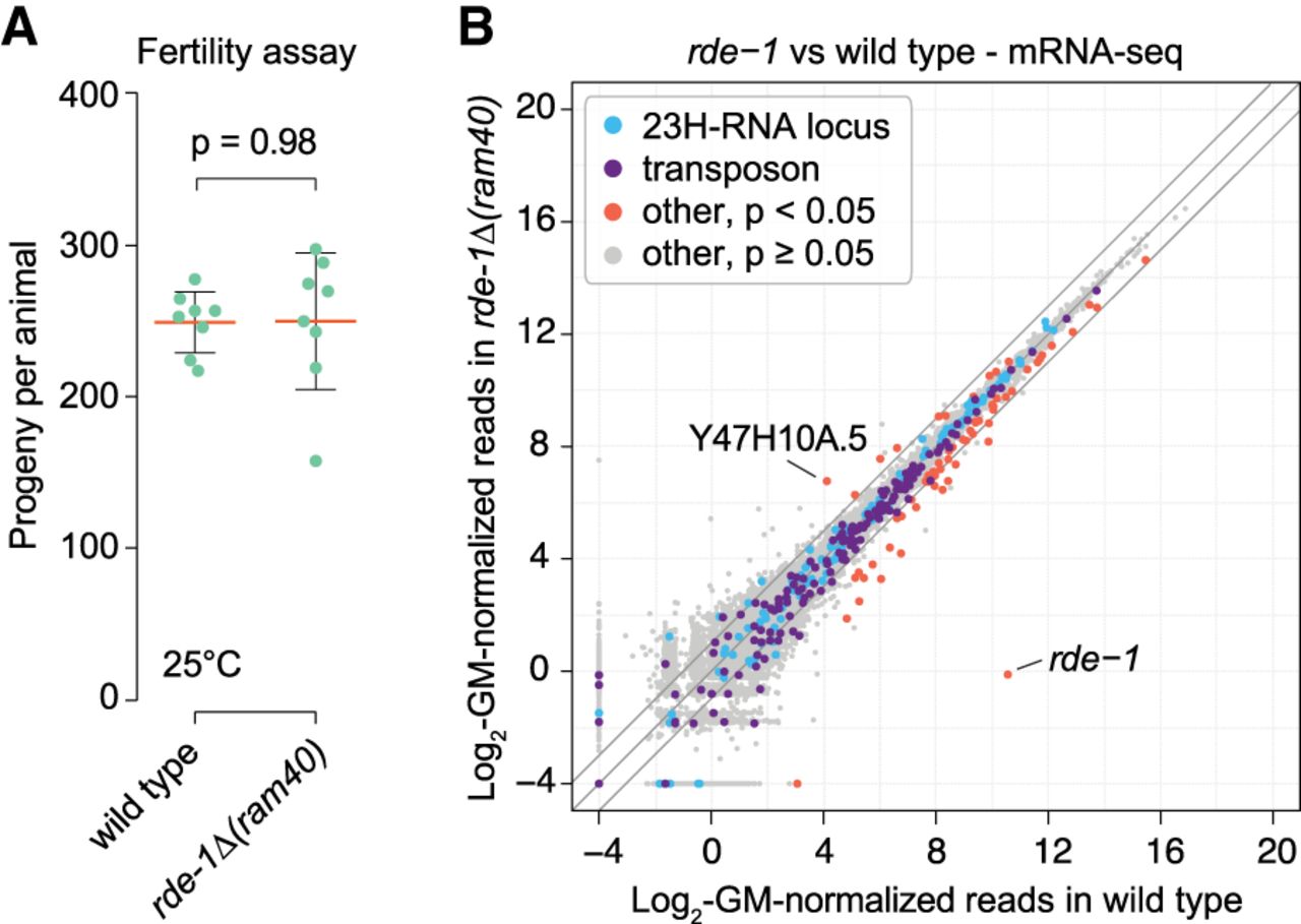 Fertility and differential mRNA expression in rde-1 mutants. (A) Each data point is the number of progeny produced by a single wild-type or rde-1Δ(ram40) mutant animal grown at 25°C. The orange bars show the means and the black error bars show the 95% confidence intervals. A two-sample t-test was used to calculate the P-value. n = 8 animals per genotype. (B) The scatter plot displays individual transcripts as a function of the average log2-geometric mean-normalized reads from wild-type (x-axis) and rde-1Δ (ram40) mutant (y-axis) mRNA-seq libraries colored by classification or P-value. None of the 23H-RNA loci had P-values < 0.05. n = 3 biological replicates for each strain. Libraries from gravid adults.