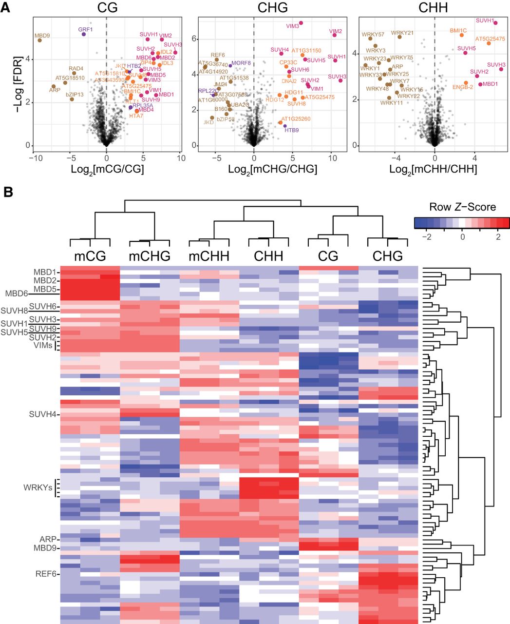 Identification of mC reader proteins in Arabidopsis from affinity pull-downs. (A) Volcano plots of the proteins statistically enriched for binding to methylated probes (known mC binders are pink, previously unknown mC binders are orange) or unmethylated probes (brown) in each context (CG, CHG, CHH). Statistically enriched proteins, often identified in mass spectrometry experiments and thus listed as contaminants in Van Leene et al. (2015), are colored purple. (B) Hierarchical clustering of the proteins (rows) statistically significantly enriched in at least one set of probes (columns, each representing a replicate). The names of proteins of interest were highlighted, the rest of the 83 proteins identified can be found in Supplemental Table S2.
