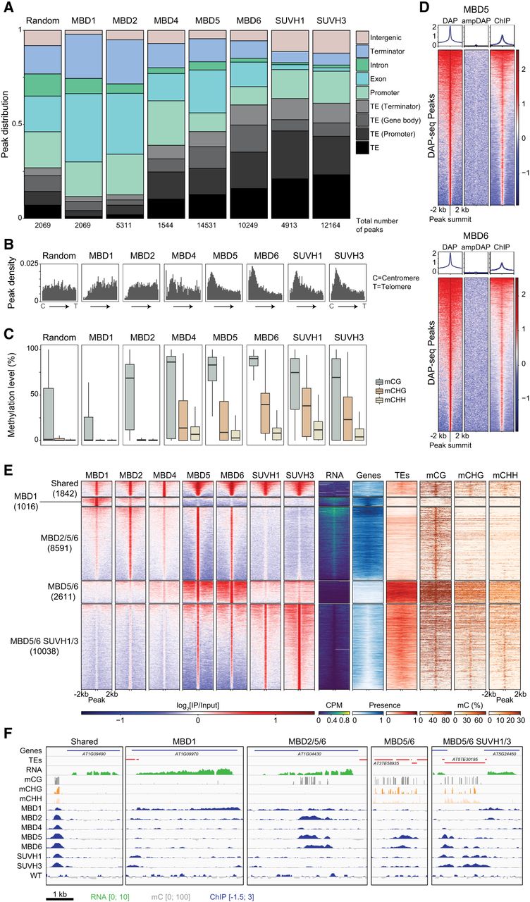 The diverse binding profiles of mC readers across the Arabidopsis genome. (A) Distribution of ChIP-seq peaks in genomic features. The total numbers of peaks for each sample are indicated at the bottom. Original annotations for TEs are indicated in parentheses. Promoters include [−1 kb; +100 bp] around the transcription start site; Terminators include [−100 bp; +1 kb] around the transcription termination site; Genes include both exons and introns. MBD1 peaks were shuffled in the genome to generate a random set of peaks. (B) The density of ChIP-seq peak positions along the Arabidopsis chromosomes, relative to their distance from the centromere (C, on the left) to the telomere of the chromosome arm they are on (T, on the right). (C) Average DNA methylation levels in WT Arabidopsis seedlings under protein-binding sites. Boxplots show the mean and quartiles of all peaks for each sample. For each context, only peaks containing at least three cytosines and a sequencing coverage ≥3 (average on all cytosines in the peak) are presented. (D) DNA affinity purification sequencing for MBD5 (top) and MBD6 (bottom) recombinant proteins on methylated (DAP) and unmethylated (ampDAP) genomic DNA libraries. Heatmaps show enrichment levels at all DAP-seq peaks, and the correlation with in vivo binding assessed by ChIP-seq. (E) Clustering of all mC reader ChIP-seq peaks based on their colocalization. Five clusters were identified, which are bound by different subsets of mC readers, and show different chromatin environments as highlighted by DNA methylation levels in each context, the transcript abundance, and the presence of annotated gene and TE features. (F) Browser displays a representative locus for each cluster defined in (E). ChIP-seq enrichment (log2 Fold Change [IP/Input]) is shown for each mC reader as well as a WT control (where the IP was performed on a WT population, with no tagged protein), along with DNA methylation in each sequence context and RNA expression in WT seedlings (log2 CPM).