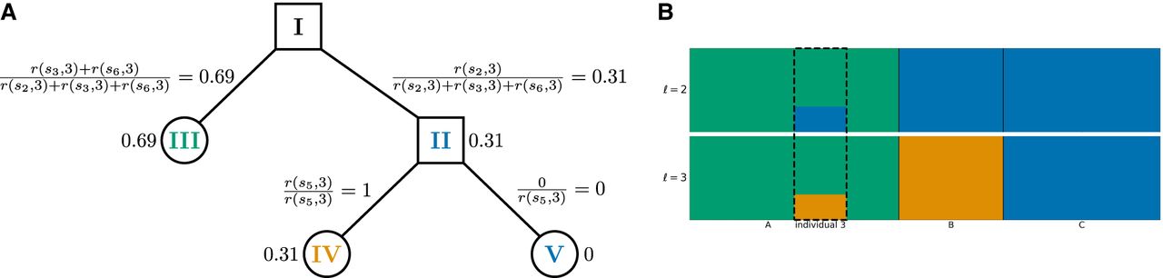 , r(s, 3) refers to the reliability factor for SNP s and individual 3 as defined in Equation 5 in the Methods section. (B) Hierarchical clustering plot of the individuals in the minimal example based on the soft clustering, with agreement parameter a = 2. Each subplot corresponds to a level ℓ in the tangles tree (Fig. 2B), where the different levels result from splits in the tangles tree. Individuals are shown on the x-axis, the y-axis illustrates the soft clustering per individual. First bar plot shows clustering into two population, second into three.