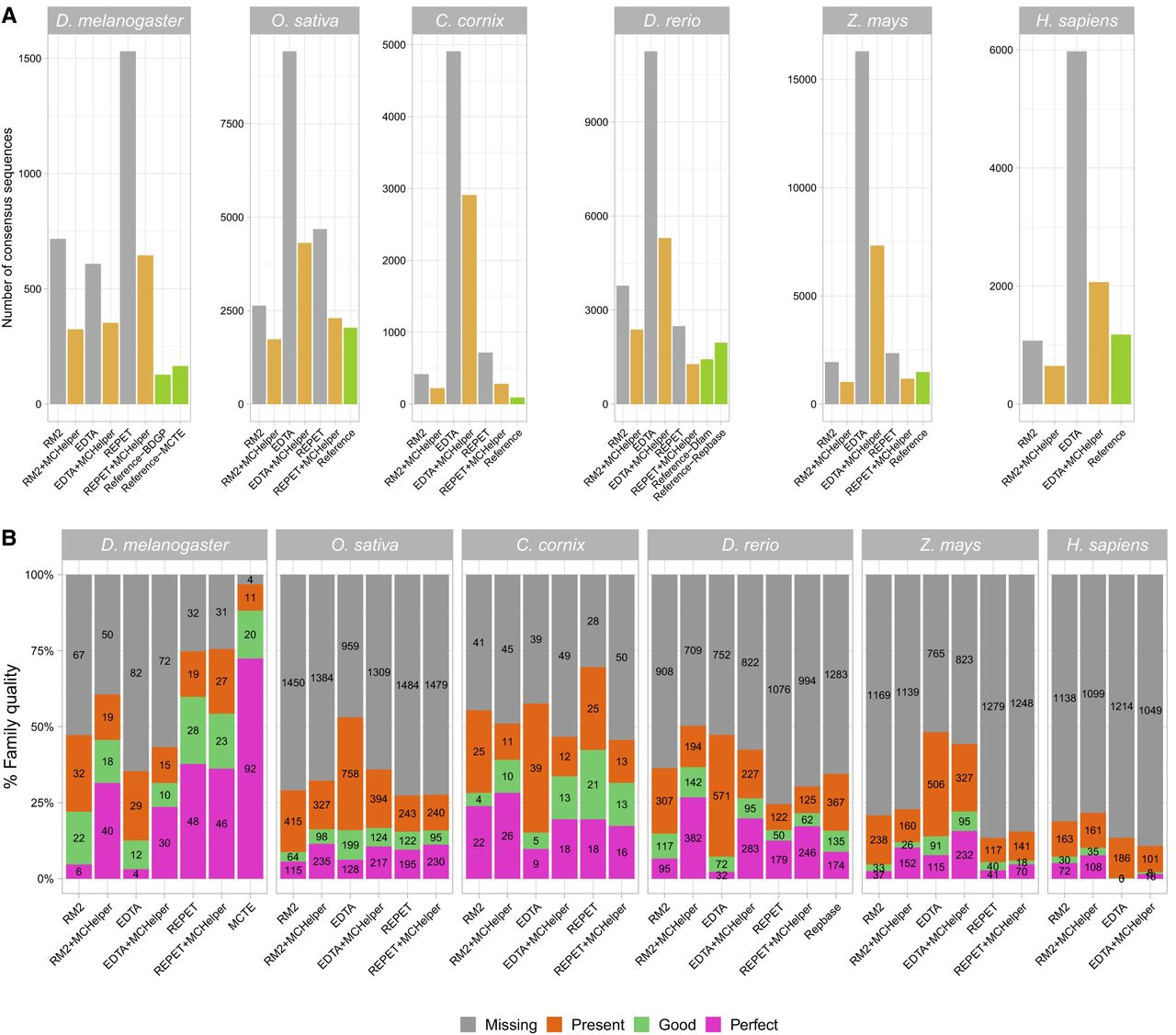 Comparison of MCHelper libraries with raw and reference libraries in the six genomes analyzed. (A) Number of consensus sequences contained in the raw library, the MCHelper library, and the reference libraries of the six species analyzed. Reference libraries used are: BDGP (Kaminker et al. 2002) and MCTE (Rech et al. 2022) for D. melanogaster, standard library (Ou et al. 2019) for O. sativa, MClibrary (Weissensteiner et al. 2020) for C. cornix, Dfam (Storer et al. 2021a) and Repbase (Jurka et al. 2005) for D. rerio, MTEC curated by Ou et al. (https://github.com/oushujun/MTEC) for Z. mays, and Dfam for H. sapiens. (B) Number of consensus sequences classified as perfect, good, present, and missing families following the methodology proposed by Flynn et al. (2020). Note that for D. melanogaster and D. rerio, the MCTE and the Repbase libraries are also compared to the BDGP and Dfam libraries, respectively.