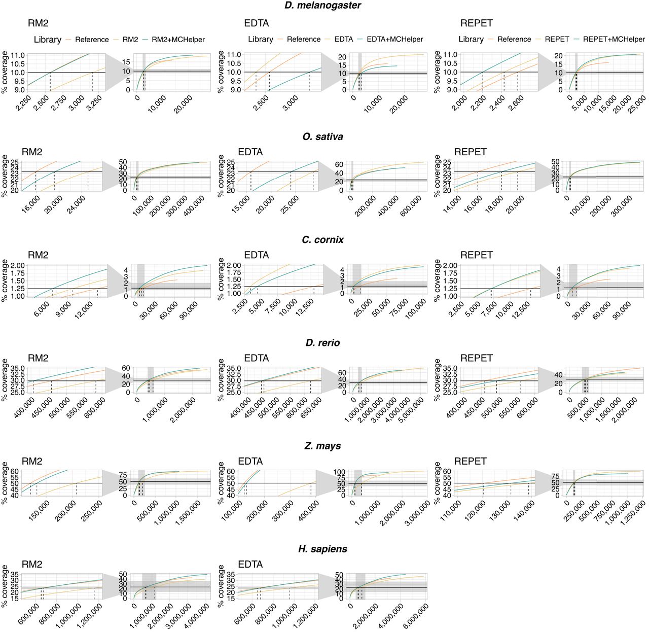 Cumulative length coverage plots for TE annotations in the six species analyzed. The black horizontal line represents half of the mobilome and it was used to calculate the LTE50 values (Table 1). The dashed vertical line indicates the NTE50 values. For each graph, a zoom capture is provided on the left to show when the cumulative length plot of each library crosses the black horizontal line (NTE50 values). Mobilome proportions are 20% in D. melanogaster (Mérel et al. 2020), 46.64% in O. sativa (Ou et al. 2019), 2.5% in C. cornix, 59.5% in D. rerio (Chang et al. 2022), and 47.68% in H. sapiens (Hoyt et al. 2022). In Z. mays, we used 50% of the full genome space to calculate the NTE50 and LTE50 as recommended by Jamilloux et al. (2017). NTE50 and LTE50 values are shown in Table 1.