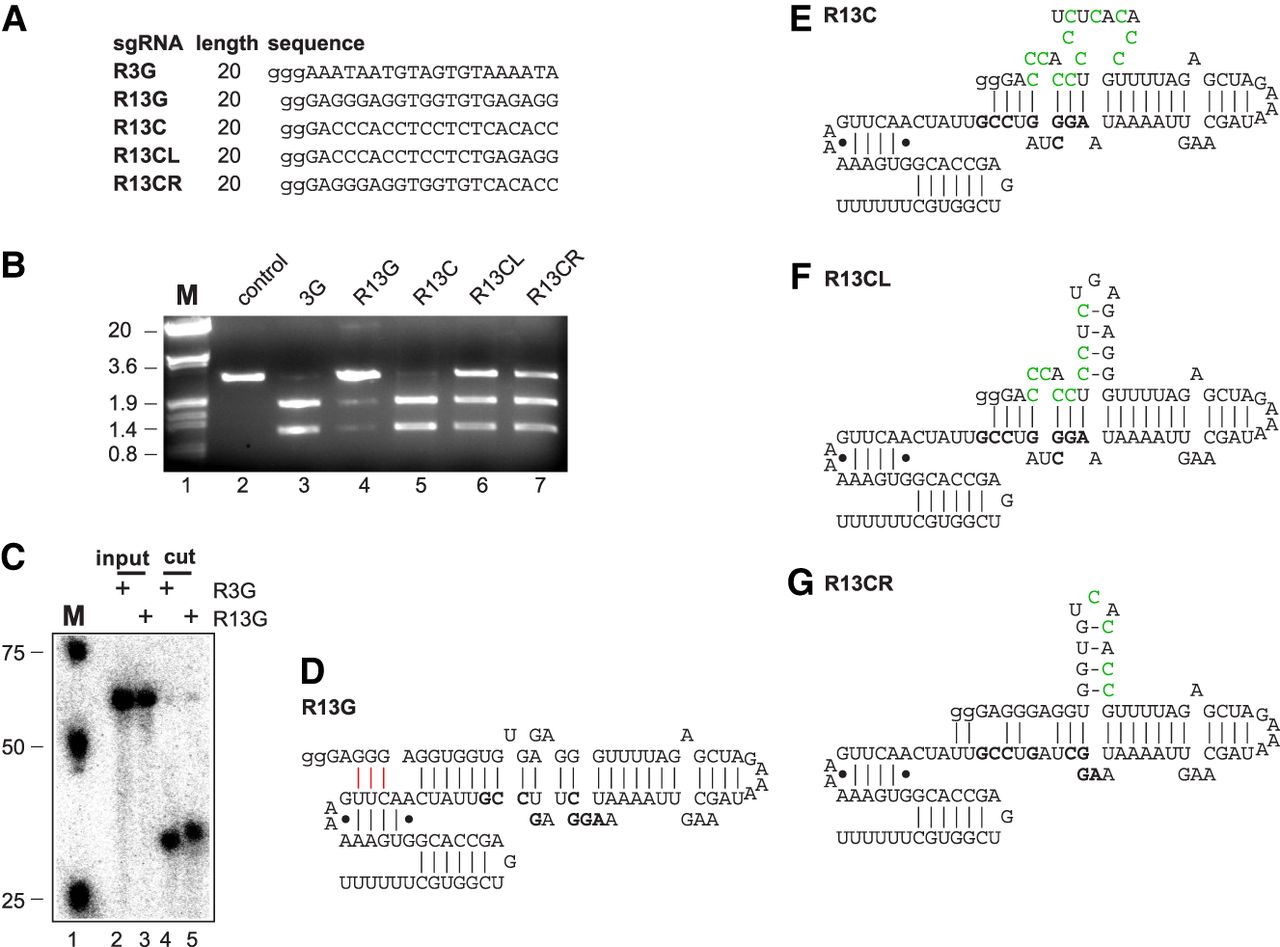 The secondary structure of sgRNAs affects Cas9-mediated cleavage efficiency. (A) Sequences of sgRNAs. Small letter guanosines used for in vitro transcription are not present in the target DNA sequence. (B) Agarose gel showing Cas9-mediated cleavage after 6 h of 3 kb pBS SK+ test-plasmids containing the target sequence with indicated sgRNAs. Plasmids were linearized with ScaI as in the control after Cas9 heat inactivation. Size markers are EcoRI/HindIII digested λ DNA of 20 kb, 3.6 kb, 1.9 kb, and 0.8 kb. (C) Denaturing acrylamide gel showing synthetic oligonucleotides before and after sgRNA/Cas9-mediated cleavage for 1 h. (D–G) Structure of sgRNAs. Nucleotides base-pairing in loop 1 are bold. Red lines in D indicate potential base-pairing with nucleotides in loop 2. Green nucleotides indicate mutations compared to sgRNA R13G.