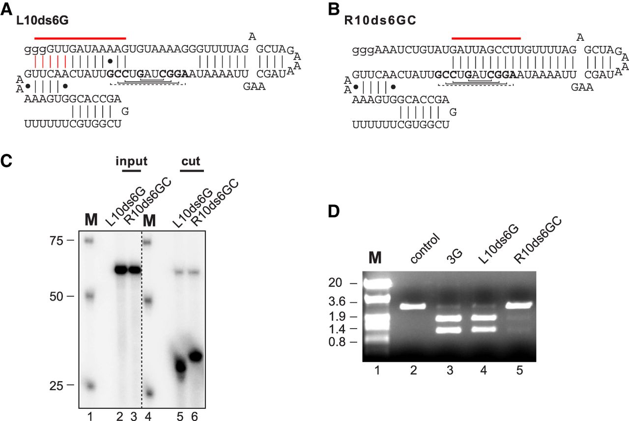 Base-pairing of sgRNAs in the seed-region blocks Cas9-mediated cleavage of a test-plasmid. (A,B) Structure of sgRNAs. Horizontal red lines in A and B indicate artificially introduced base-pairing with the sgRNA scaffold, and vertical red lines in a indicate potential base-pairing with nucleotides in loop 2. Nucleotides base-pairing in loop 1 are bold. (C) Denaturing acrylamide gel showing synthetic oligonucleotides before and after sgRNA/Cas9-mediated cleavage for 1 h. Note that Cas9 cleavage is heterogeneous. (D) Agarose gel showing Cas9-mediated cleavage after 6 h of 3 kb pBS SK+ test-plasmids containing the target sequence with indicated sgRNAs. Plasmids were linearized with ScaI as in the control after Cas9 heat inactivation. Size markers are EcoRI/HindIII digested λ DNA of 20 kb, 3.6 kb, 1.9 kb, and 0.8 kb.