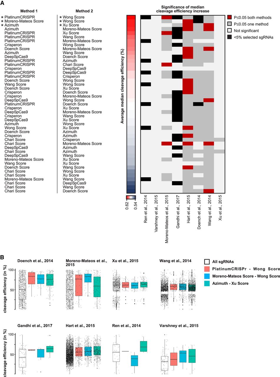 Combinations of two sgRNA selection tools select high-efficiency cleaving sgRNAs for several sgRNA efficiency screen data sets. Combinations of sgRNA selection tools in A are listed according to the overall cleavage efficiency of selected sgRNA significant (P < 0.05) for both methods (red) or one method (dark gray). Black indicates events with <5% of sgRNAs selected by at least one method. Comparison of sgRNA selection by different sgRNA selection tools shown as the median of the cleavage efficiency for individual data sets (B). The distribution of cleavage efficiencies for all sgRNAs is shown on the left (white box) and for PlatinumCRISPr–Wong score in red, Moreno-Mateos–Wong score in blue, and Azimuth–Xu score in green.
