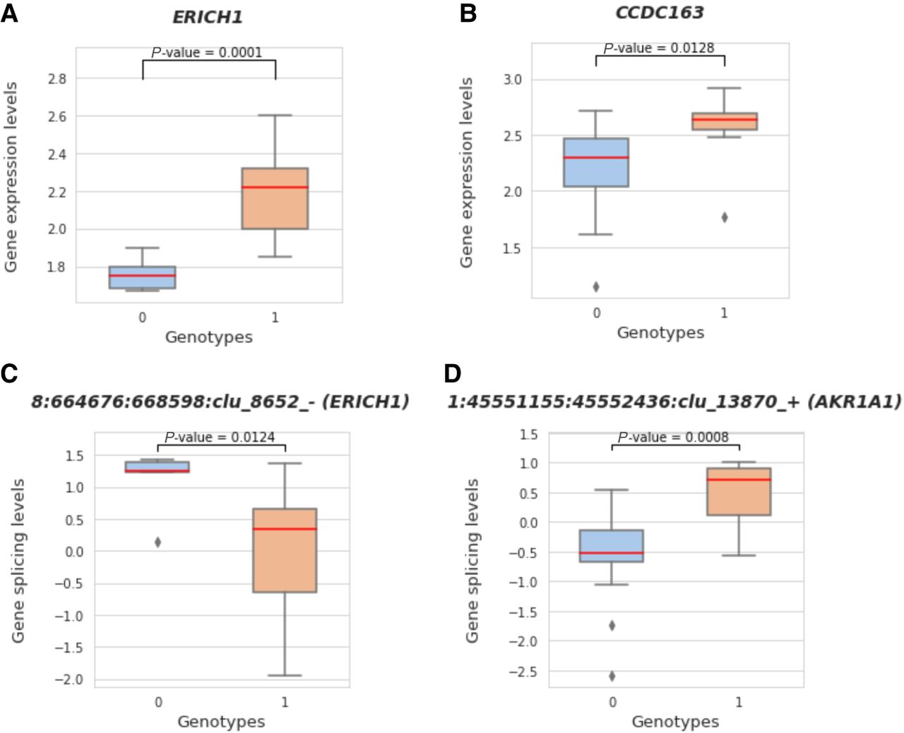 Visualization of two SVs that disrupt TAD boundaries with significant changes in gene expression and splicing levels. (A) Boxplot demonstrates the significant difference in gene expression for two different genotype categories, 0 (genotype 0/0) and 1 (genotypes 0/1, 1/0, or 1/1). The boxplot on the left shows the significant changes between the associated ERICH1 gene expression values (after log transformation) and different genotypes of this deletion Chr 8-644401-DEL-5014. (C) Boxplot shows the significant difference between gene splice ratios (after log transformation and quantile normalization) for the splice junction clusters and genotypes of the same deletion, which is also associated with the ERICH1 gene. (B,D) The same comparisons for an example of insertion (Chr 1-45497763-INS-354) associated with the CCDC163 and AKR1A1 genes between genotype categories 0 and 1.