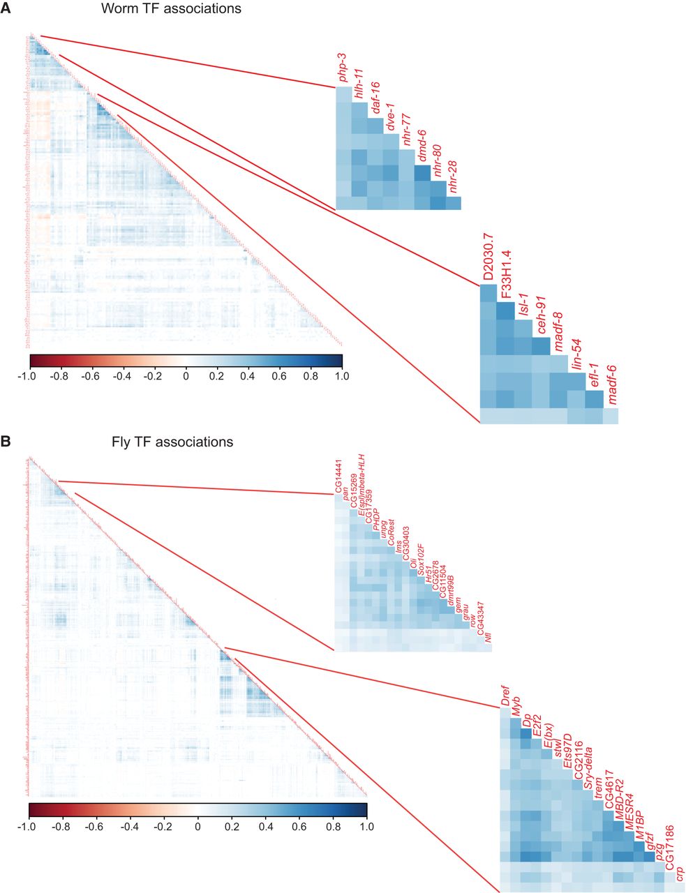 Correlation of TF–TF pairs. Peaks of some TF pairs occur in the same metapeaks more frequently than others as measured by Pearson's correlation for both worm L4/YA experiments (A) and fly embryo experiments (B). Two clusters of TFs with correlated peaks are highlighted for each species but others are also evident. Negative associations are evident on the left side of the worm plot.