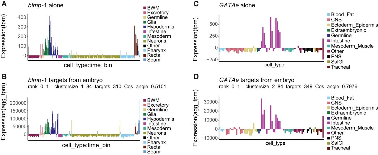 TF expression correlates with target gene expression. (A–D) Aggregate target expression reflects the TF expression for the worm blmp-1 (A) TF and (B) targets, and the fly GATAe (C) TF and (D) targets. Cell types are arranged along the x-axis by broad cell class and sorted alphabetically within each class. The worm cell types are further divided into time bins (from Supplemental Files S6, S7; Packer et al. 2019).