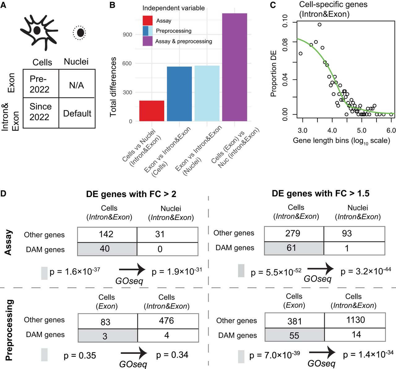 Impact of differential bioinformatic preprocessing on comparison within and between experiments. (A) Recommended bioinformatic processing of scRNA-seq and snucRNA-seq has converged over time according to CellRanger documentation. (B) The processing method (blue bars) has a larger effect on differential expression testing than does assay choice (red bar) in microglia. Historical paradigm in which nuclei and cells use two different processing methods maximizes apparent differences (purple). (C) GOseq analysis of genes significantly more abundant in microglial cells than nuclei with Intron&Exon quantification (FC > 1.5). Genes are grouped into bins of size 300 based on their length. Note that the correlation is negative in this instance because cell-specific genes are depicted rather than nucleus-specific genes. (D) GOseq analysis of genes significantly more abundant (FC > 1.5 or FC > 2) in response to a change in assay (top) or preprocessing (bottom). In either case, DAM genes are enriched at the FC > 1.5 threshold, and GOseq reduces but does not remove the strong statistical significance. At FC > 2, DAM genes are not significantly enriched in response to preprocessing.