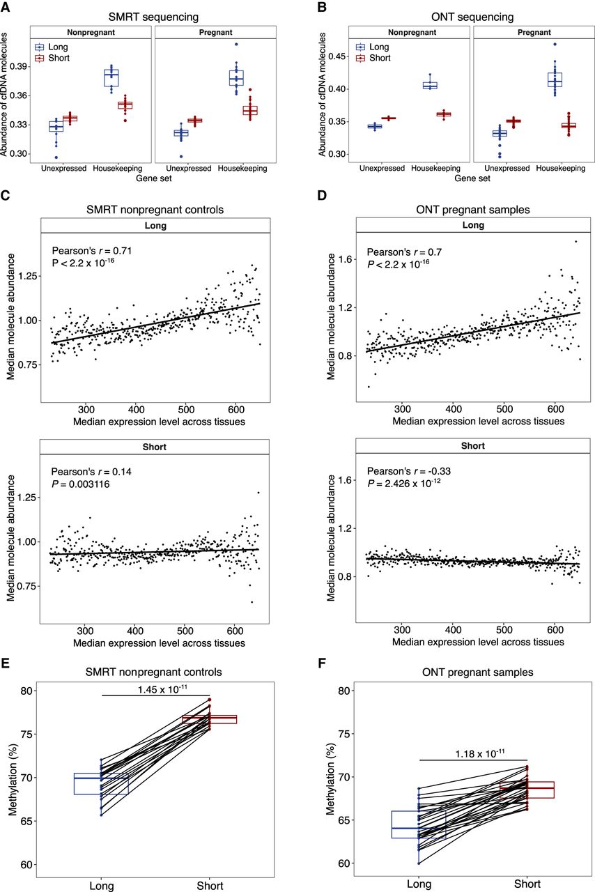 The abundance of long cfDNA molecules shows a positive correlation with transcriptional activity. (A,B) The abundance of long and short molecules on gene bodies of unexpressed and housekeeping genes for nonpregnant controls and pregnant subjects. (A) Data from SMRT sequencing. (B) Data from ONT sequencing. (C,D) The correlation between gene expression and molecule abundance. The median expression level of a gene across tissues was log-transformed and scaled. The median molecule abundance was derived from scaled expression levels. P-values by Pearson's correlation test. (C) Pooled data of 15 nonpregnant controls from SMRT sequencing. (D) Pooled data of 31 pregnant samples from ONT sequencing. (E,F) Comparisons of DNA methylation between long and short molecules. Data points from one sample are connected with a black line. P-values by Wilcoxon rank-sum test. (E) Data from SMRT sequencing. (F) Data from ONT sequencing.
