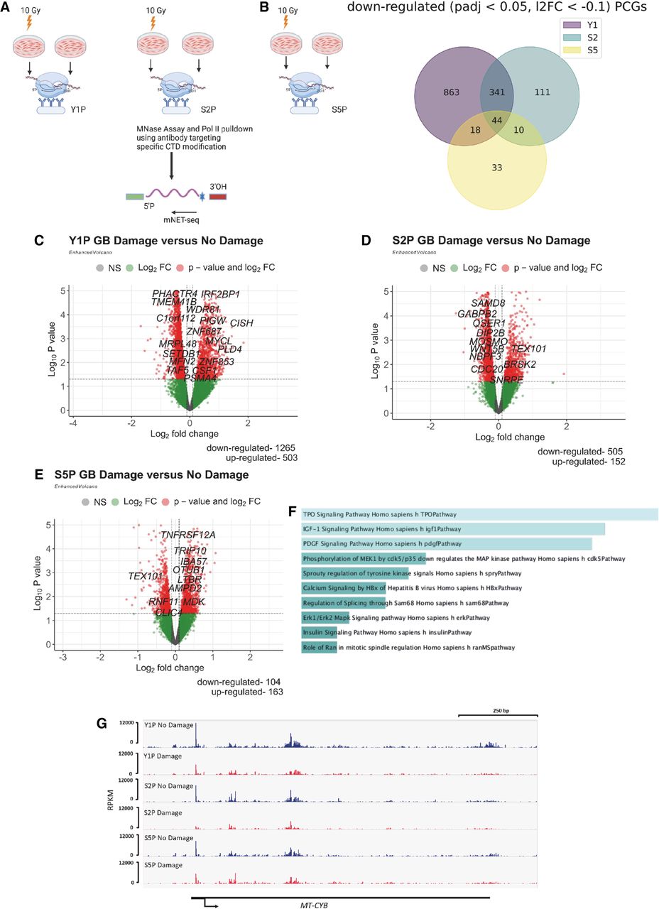 IR-induced DNA damage leads to global down-regulation of protein-coding genes (PCGs). (A) mNET-seq experimental design shows the sample preparation of irradiated and nonirradiated U2OS cells from which Y1P, S2P, and S5P RNA Pol II were precipitated for mNET-seq. (B) Venn diagram of significantly down-regulated (Padj < 0.05, log2FC < −0.1) PCGs based on read coverage across the gene body (GB) from Y1P, S2P, and S5P samples after IR. (C) Volcano plots of differentially expressed PCGs based on read coverage across GB from Y1P samples upon IR. (D) Volcano plots of differentially expressed PCGs based on read coverage across GB from S2P samples upon IR. (E) Volcano plots of differentially expressed PCGs based on read coverage across GB from S5P samples upon IR. (F) GO enrichment of significantly down-regulated genes across Y1P, S2P, and S5P samples upon IR. (G) IGV profile of mNET-seq signal across a representative down-regulated gene, MT-CYB.