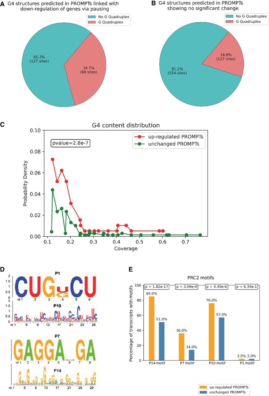 IR-induced Y1P-transcribed PROMPTs are enriched in PRC2 binding motifs. (A) Pie chart showing the proportion of sequences predicted to harbor a rG4 structure among the up-regulated (P-value < 0.05, log2FC > 0.1) PROMPTs, which are correlated with down-regulated GB expression and increased PI upon IR from Y1P samples. (B) Pie chart showing the proportion of sequences predicted to harbor a rG4 structure among the unchanged (−0.05 log2FC < 0.05 or P-value > 0.05) PROMPTs upon IR from Y1P. (C) Probability density plots representing rG4 coverage across up-regulated PROMPTs, which are linked with down-regulated GB expression and increased PI versus unchanged PROMPTs upon IR from Y1P samples. A Mann–Whitney U test is used to compare median values of the two probability distributions. (D) RNA-binding motifs of PRC2 identified using dCLIP (Rosenberg et al. 2021). (E) Bar charts showing the percentage of sequences containing a PRC2 motif among the up-regulated (P-value < 0.05, log2FC > 0.1) PROMPTs, which are correlated with down-regulated GB expression and increased PI upon IR from Y1P samples versus unchanged PROMPTs. A Mann–Whitney U test was to compute statistical significance in the difference in enrichment of PRC2 motifs between up-regulated and unchanged PROMPTs.