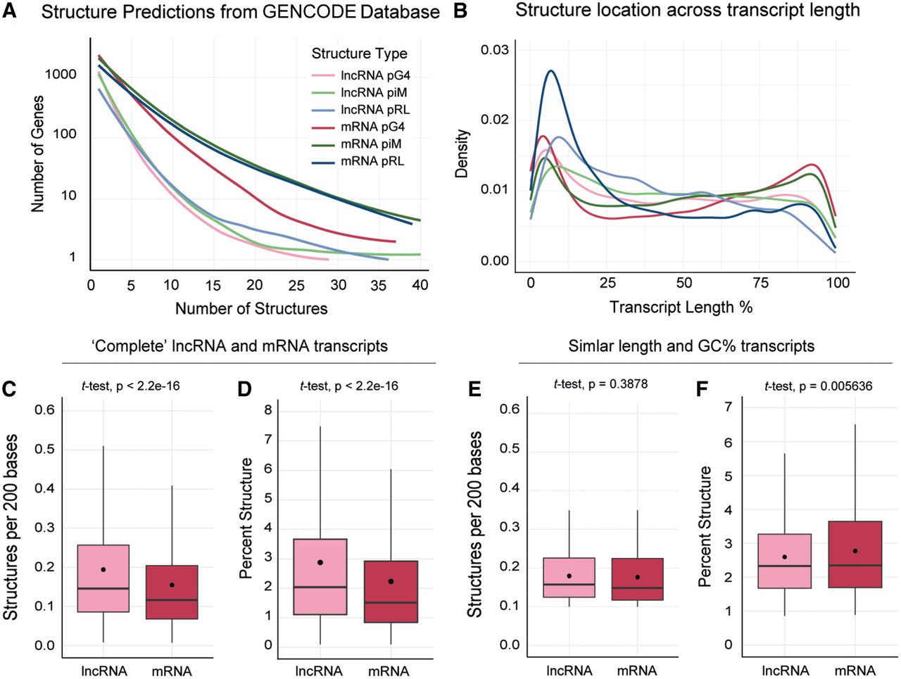 Comparisons between predicted structures in lncRNA and mRNA data sets. (A) Line graph showing the density of each structure in unique genes. The number of structures is limited to a maximum of 40 in a single gene for clarity (for full graph, see Supplemental Figure S1A). (B) Line graph showing the distribution of pG4, piM, and pRL structures across transcript length (5′ to 3′). Figure legend same as for panel A. (C,D) Boxplots showing the density of pG4s within the transcript (C) and the total percentage of the transcript consisting of pG4s (D) for the complete lncRNA and mRNA transcriptomes. Outliers removed for clarity, full graph in Supplemental Figure S1B,C. (E,F) Boxplots showing the density of pG4s within the transcript (E) and the total percentage of the transcript consisting of pG4s (F) for the lncRNAs and mRNAs with near-equivalent transcript length and GC content. For length standardization in C and E, the number of pG4/piM/pRL structures within a given transcript was divided by the transcript length to get the number of structures per base and then multiplied by 200. The number of bases used here is arbitrary and does not affect comparisons made between lncRNA and mRNA data sets.