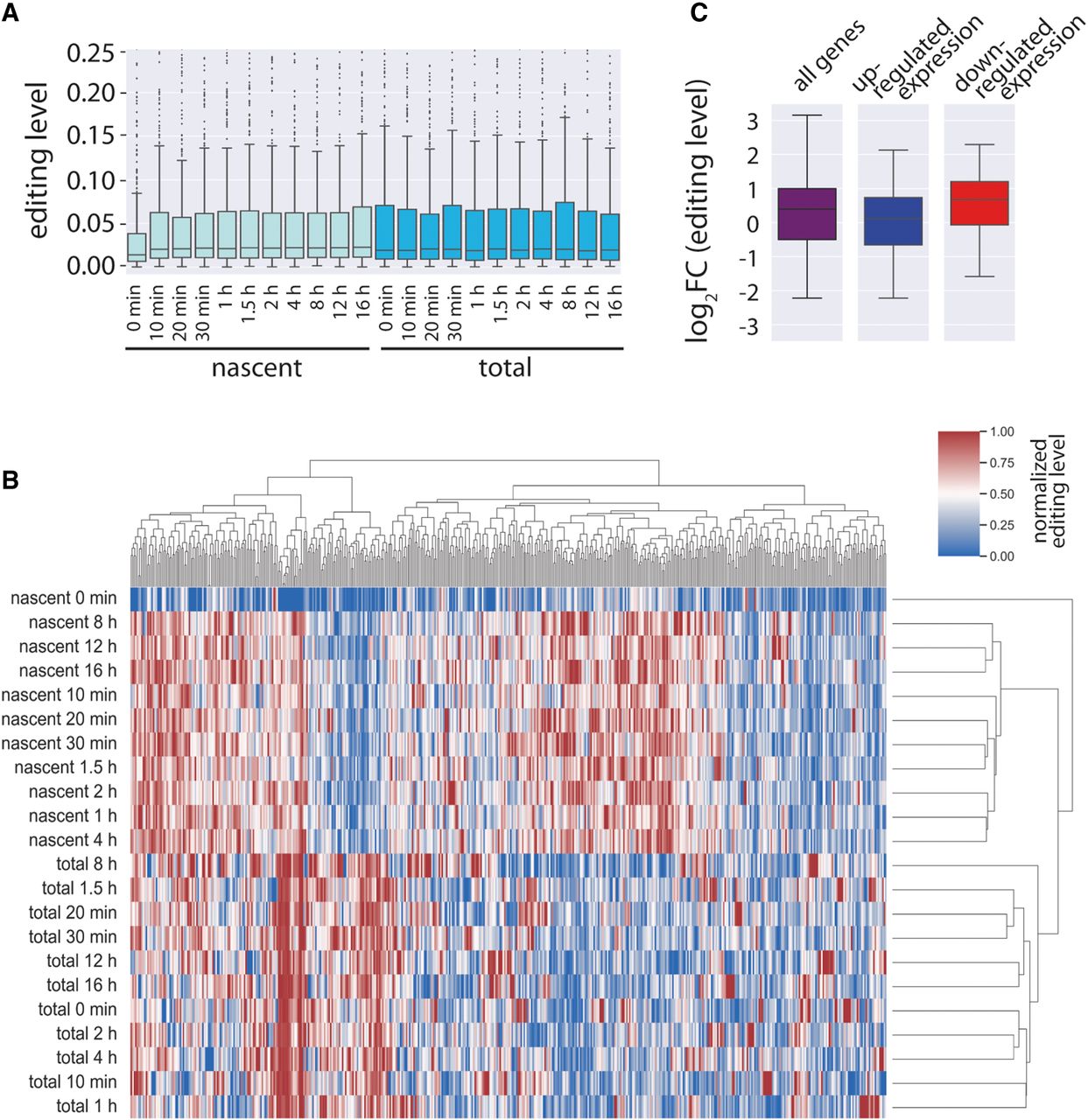 Analysis of editing in nascent and total RNA following activation of the transcription factor MYC reveals an up-regulation of editing levels upon MYC activation. Analysis of editing levels in a published data set in which nascent and total RNA were sequenced at 11 different time points following MYC activation. (A) Box plot showing median editing levels for all editing sites detected in the data set. (B) Editing levels were normalized across the entire time course and clustered using an unsupervised hierarchical clustering approach. Supplemental Table S2 shows all the editing sites sorted accordingly to the figure with individual gene names and editing site coordinates. (C) Log2 fold-change in editing levels between time point 0 min and 10 min after MYC activation for all the editing sites intersected with pre-mRNA expression data (all; purple). Those sites were split into sites associated with up-regulated (blue) or down-regulated (red) genes.