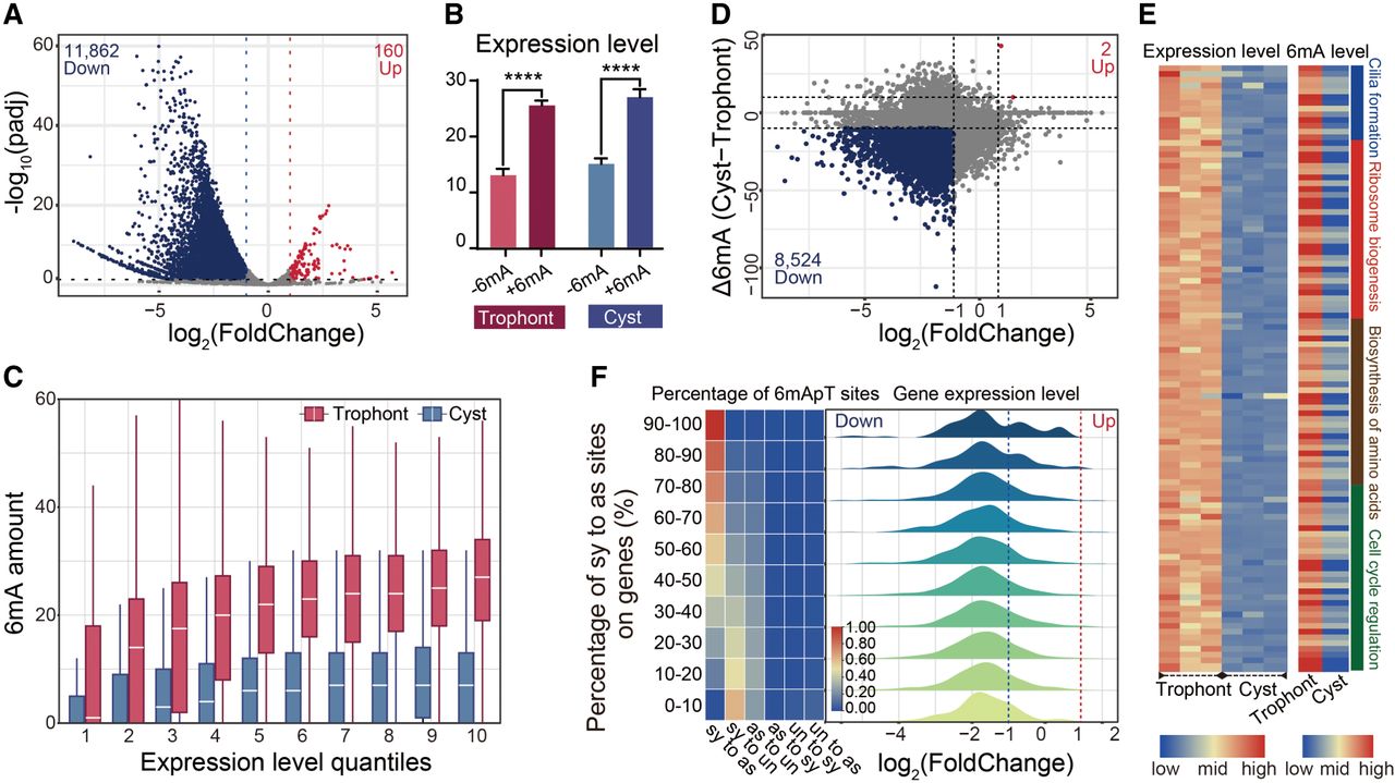 The active transcriptional mark 6mA correlates with gene expression alterations. (A) Global transcriptome analysis in trophonts and cysts based on spike-in RNA-seq data. Differentially expressed genes (DEGs) are highlighted (log2(FoldChange) ≥ 1 or ≤−1, P ≤ 0.05; down-regulated in blue and up-regulated in red). (B) Statistical analysis of expression levels (FPKM) of genes with 6mA (+6mA) or without 6mA (−6mA) was performed for trophonts and cysts, respectively. (****) P < 0.0001 (Student's t-test). (C) 6mA amount in genes with different expression levels in trophonts and cysts. Genes are ranked from low to high by their expression levels (FPKM) and divided into 10 quantiles. (D) Plots of log2(FoldChange) and Δ6mA. Genes with up-regulated expression (log2(FoldChange) ≥ 1) and up-regulated 6mA (Δ6mA ≥ 10) are highlighted in red. Genes with down-regulated expression (log2(FoldChange) ≤ −1) and down-regulated 6mA (Δ6mA ≤ −10) are highlighted in blue. Δ6mA was defined as the 6mA site number in cysts minus 6mA in trophonts. (E) Correlation between expression (left) and 6mA (right) levels of genes associated with encystment. (F) All possible 6mApT conversions from trophont to cyst were counted in each gene: (sy to as) symmetric to asymmetric, (sy to un) symmetric to unmethylated, (as to sy) asymmetric to symmetric, (as to un) asymmetric to unmethylated, (un to sy) unmethylated to symmetric, and (un and as) unmethylated to asymmetric. Genes were divided into 10 quantiles by their proportion of symmetric to asymmetric conversion in all 6mApT conversions, and the proportion of each 6mApT conversion is shown in a heatmap (left). (Right) Log2(FoldChange) distribution for each group of genes.