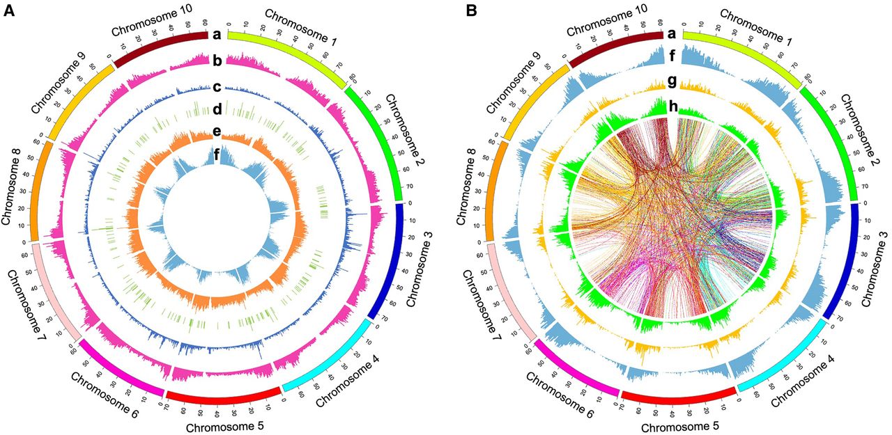 Distribution of genome-wide variations in the sorghum Bioenergy Association Panel (BAP). (A) Distribution of gene density and copy number variant (CNV) type structural variants (SVs), including deletions (DELs), duplications (DUPs), and insertions (INSs). From the outermost layer to the innermost layer of the Circos (Krzywinski et al. 2009) plot are chromosomes (a), DEL density (b), DUP density (c), INS density (d), single-nucleotide polymorphism (SNP) density (e), and gene density (f). Annotated genes were primarily located flanking centromeres as expected. Most of the identified SNPs were distributed in the gene-sparse regions. CNV-type SVs showed a different distribution pattern than did SNPs and were mainly situated in the gene-rich regions. The densities of the genes and CNV-type SVs were calculated in 500-kb windows. (B) Distribution of gene density and rearrangement (REA)-type SVs, including inversions (INVs) and translocations (TRAs). From the outermost layer to the innermost layer of the Circos plot are chromosomes (a), gene density (f), INV density (g), and TRA density (h). The core of the Circos plot is a spanning diagram of the identified TRAs. The links show the two breakpoints located in different chromosome positions for each TRA. Each link is colored by the chromosome color of the start position of the corresponding TRA. As with CNV-type variations, identified INVs and TRAs were distributed mainly in gene-enriched zones. Frequent rearrangement flows were observed between chromosomes. The densities of the genes and REA-type variants were calculated in 500-kb windows. The link diagram was evenly thinned (1/256) from the total TRAs.